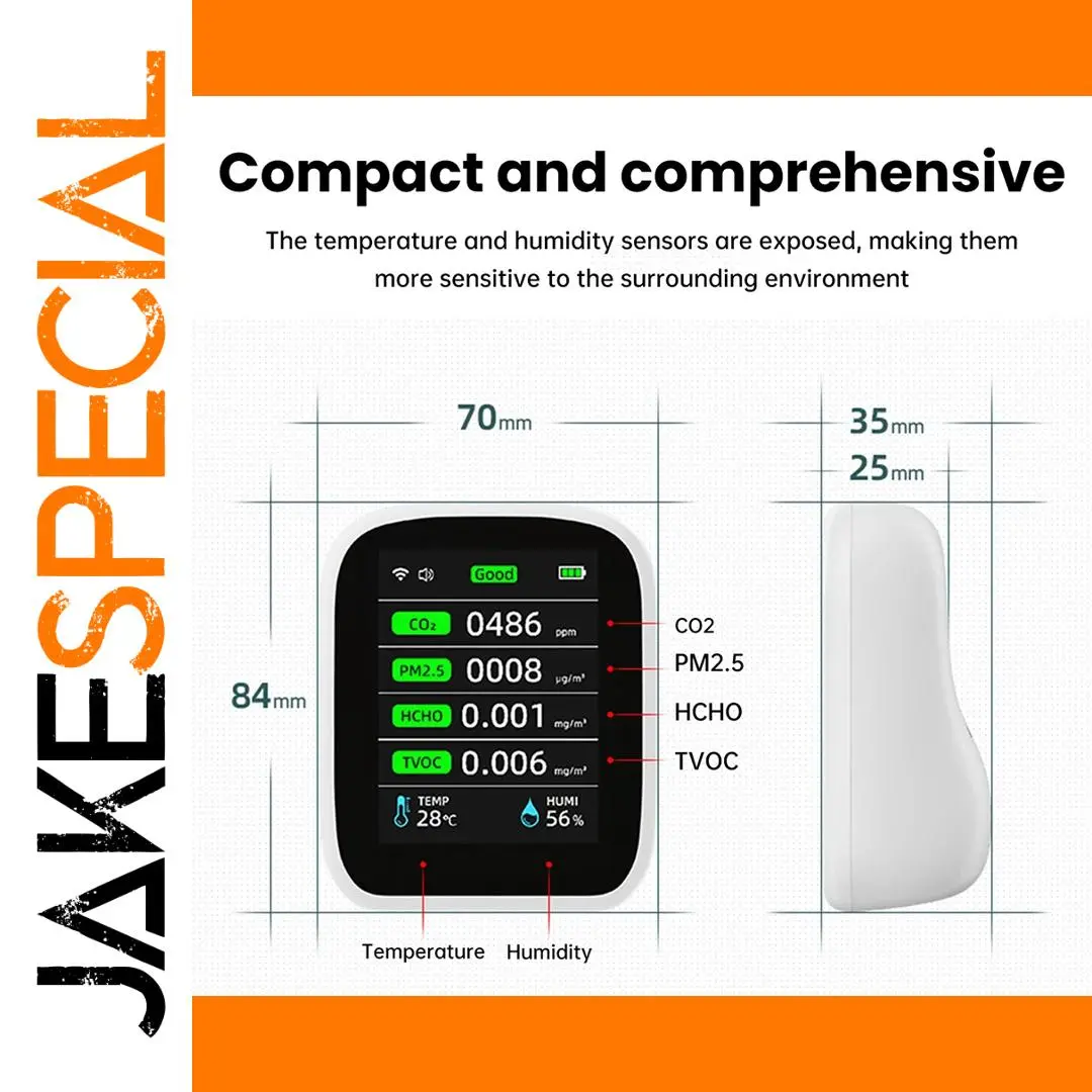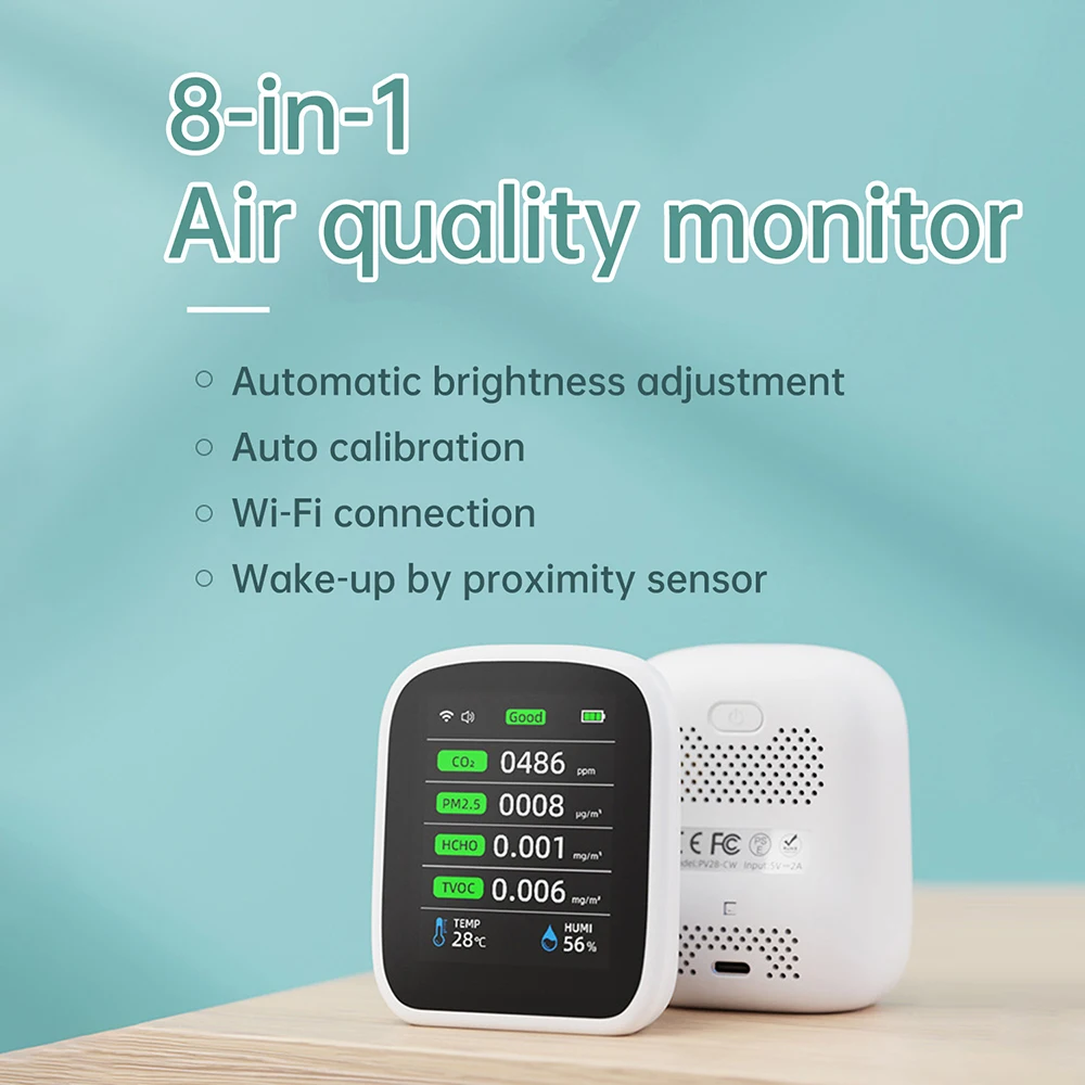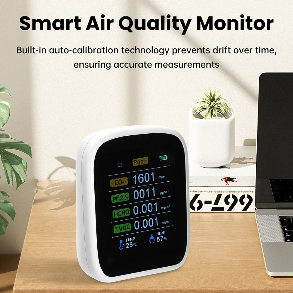 - The 8-in-1 multi-functional device measures CO2, PM1.0, PM2.5, PM10, HCHO, TVOC, temperature, and humidity with high precision for comprehensive air quality monitoring.