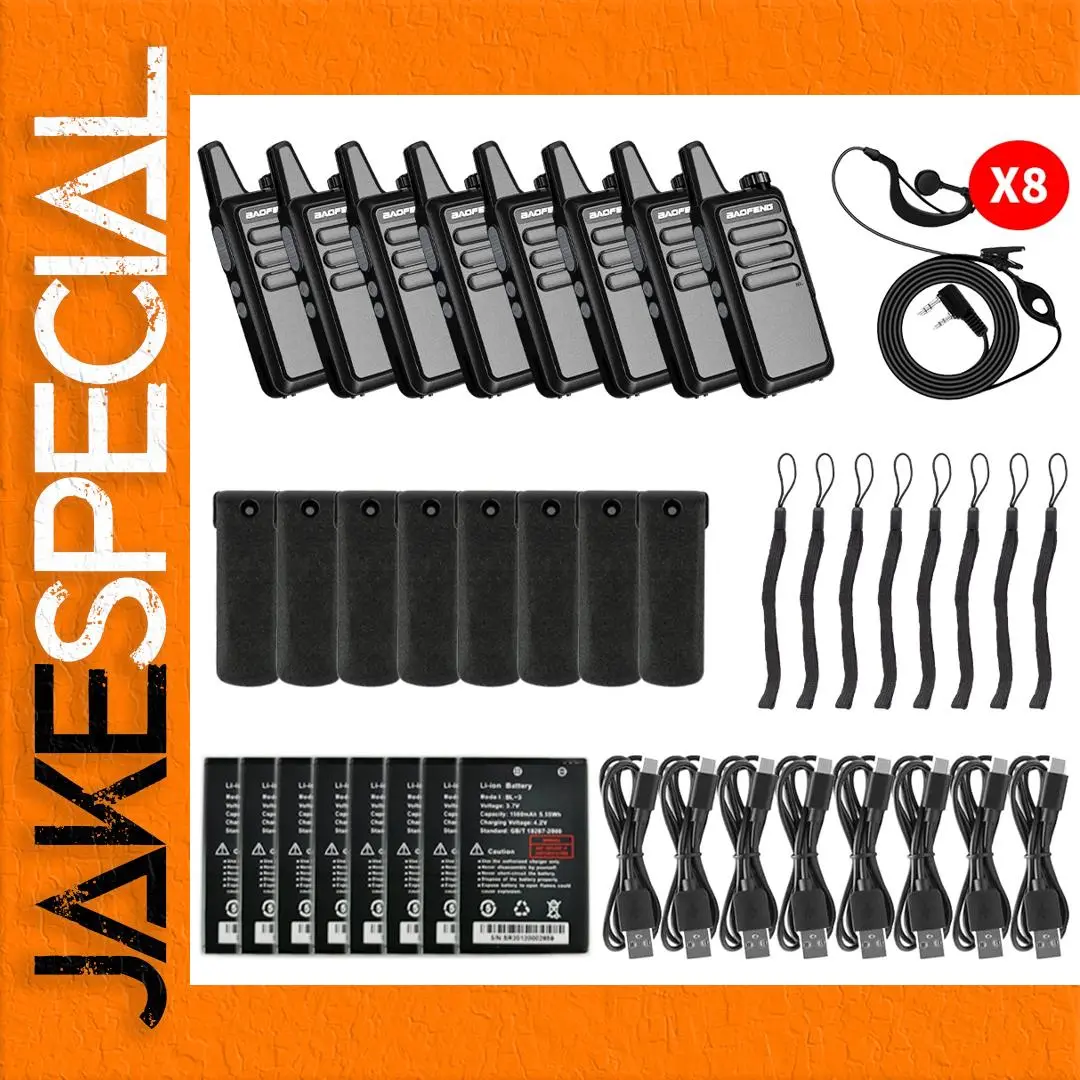 Experience reliable communication with this set of eight lightweight and durable walkie-talkies, designed for seamless connectivity over distances of up to 3 km. Crafted from sturdy plastic with a sleek matte black finish, each device measures 55mm wide, 20mm thick, and 130mm high, fitting comfortably in your hand. An integrated flexible antenna ensures long-distance transmission, while the textured gray speaker grill enhances the modern aesthetic. With practical features like a compact design, adjustable volume, and easy-to-operate buttons, these walkie-talkies are perfect for professional and leisure use alike. They include rechargeable 1500mAh lithium-ion batteries, supporting USB quick charging, making them ideal for outdoor adventures, business, or event coordination.