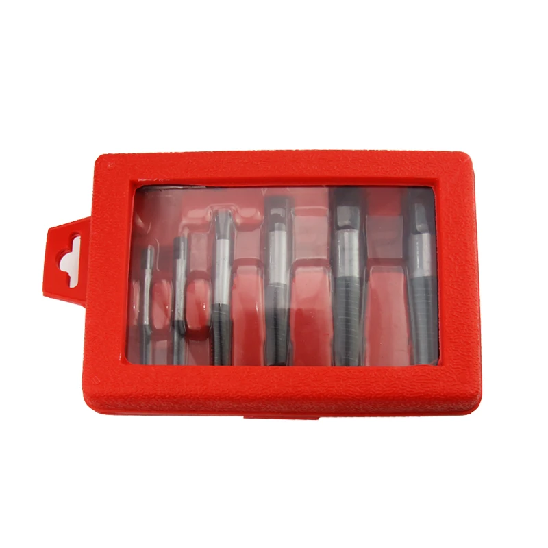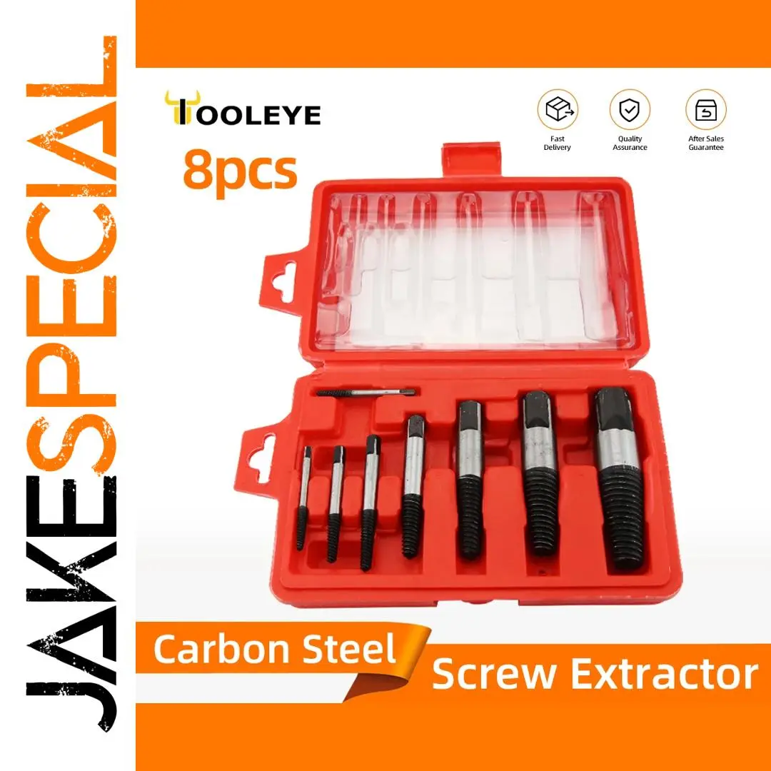 Imagine effortlessly removing broken screws and bolts with this professional-grade set. Crafted from high-carbon steel, these extractors boast a sturdy, durable design with a brilliant silver metallic finish. The tools feature a tapered, cylindrical shape with spiral fluted working ends, enhancing grip and precision during extraction. The black threaded sections add a striking contrast, allowing easy handling and setup with drills or handles. The vibrant red plastic case provides a sleek, functional container, ensuring safe storage and portability. Sized from 1# to 8#, including 1#, 2#, 3#, 4#, 5#, 7#, and 8#, this set is your go-to solution for metal fastener removal tasks, whether at home or in the office.
