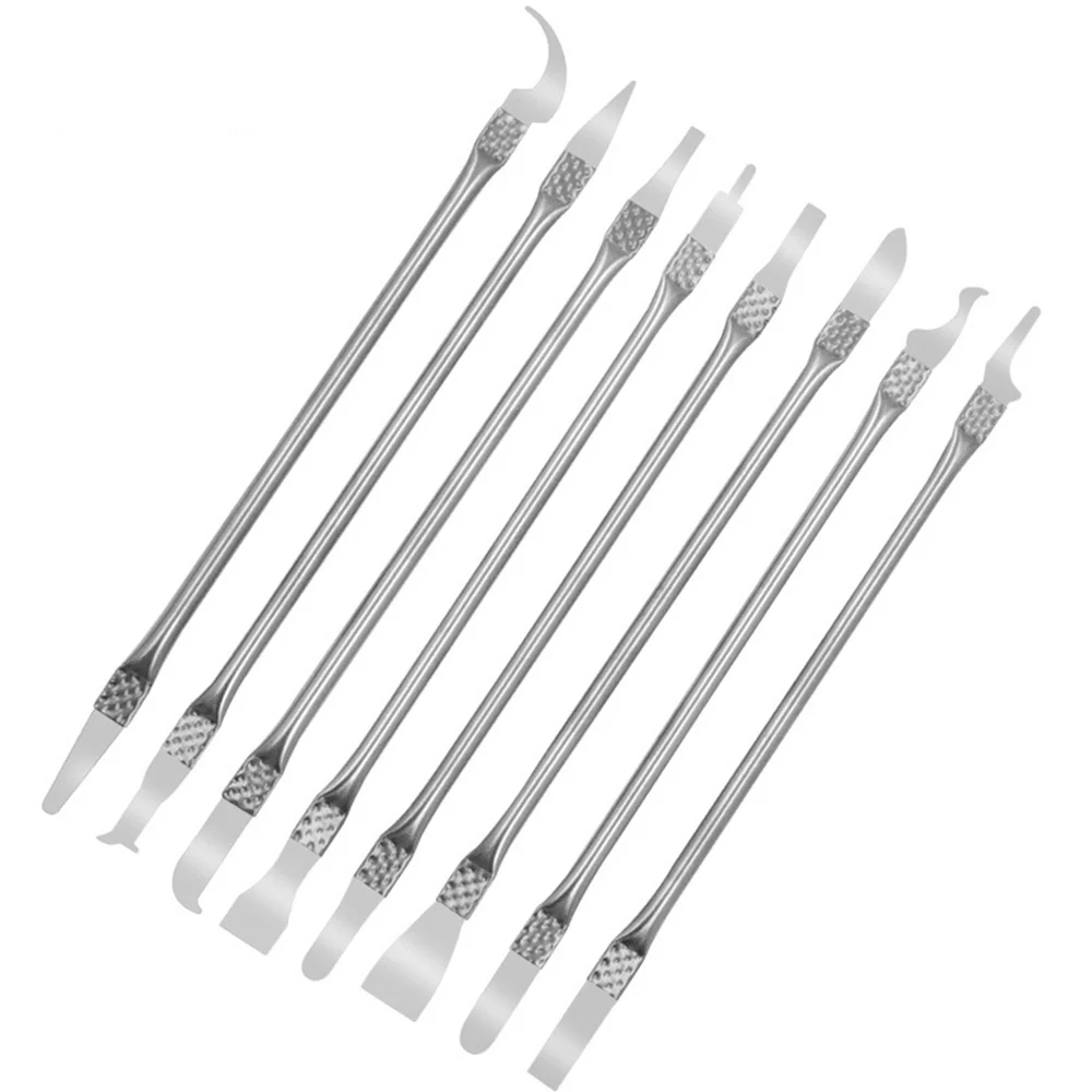 Discover the ultimate set of eight stainless steel tools designed specifically for electronic repairs. Each tool features a sleek, silver finish with a smooth polished surface that reflects light, highlighting their precision craftsmanship. These durable, compact, and lightweight tools are perfect for professional and DIY repair enthusiasts alike. Whether you're dismantling phone CPU chips, removing NAND ICs, or cleaning glue residues, this set offers the perfect shape and tip for every task. With textured grips, you’ll enjoy enhanced control and comfort during detailed maneuvers. Designed for reliability and performance, these tools transform complex repairs into manageable, precise work. They’re an essential addition to your toolkit for mobile phone and computer servicing.