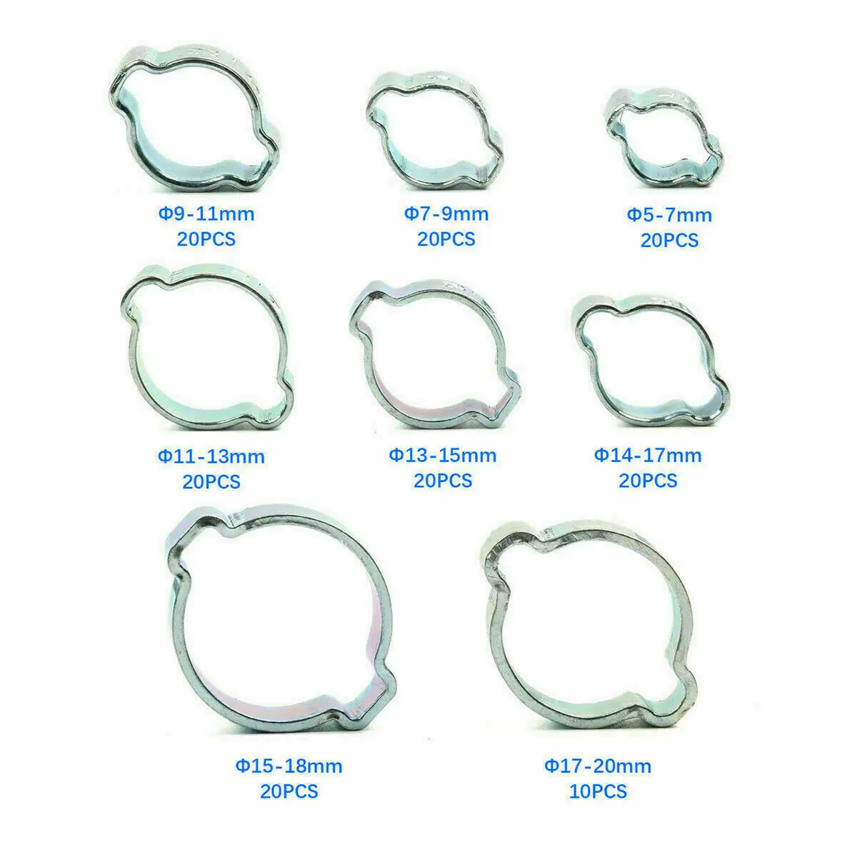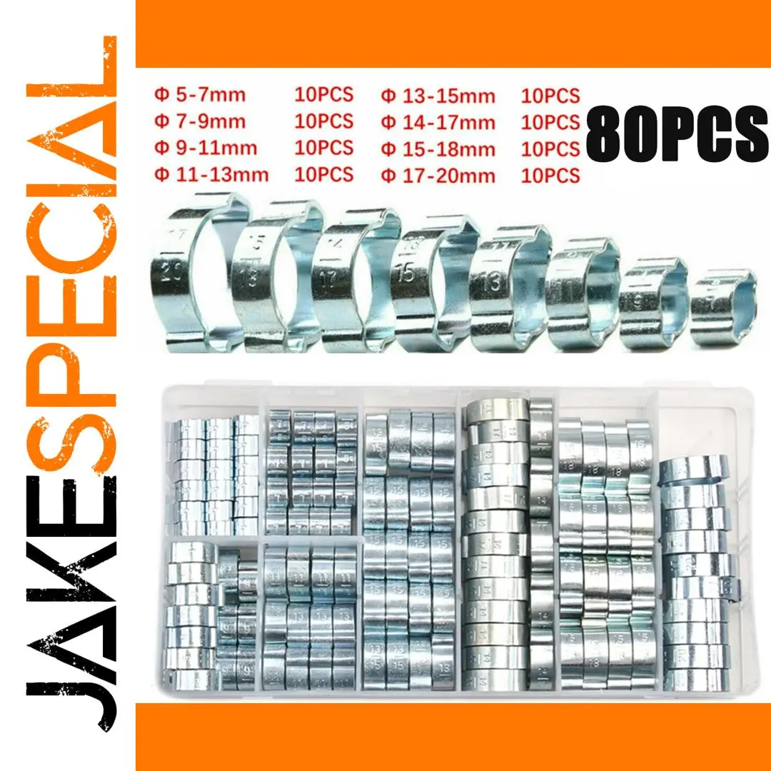 - Technical specifications include: Material – St 34 steel, zinc coating – Cr3, size range – 5-7mm OD, total pieces – 80, intended for high-performance hose securing in metalworking, automotive, andDIY settings.