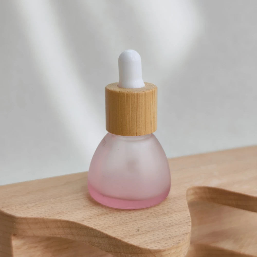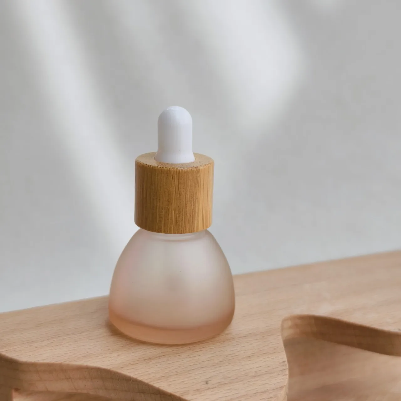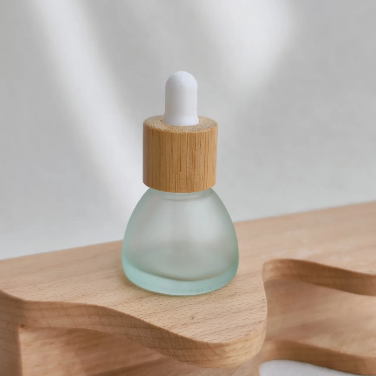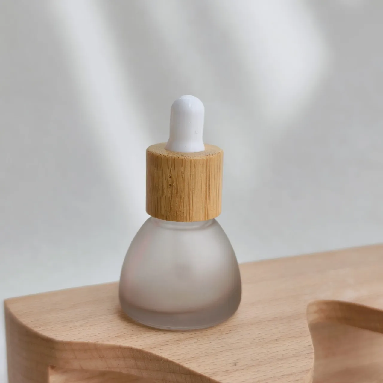 - Natural wooden dropper cap with a cylindrical shape and slight taper; provides an elegant, organic contrast to the frosted glass body, enhancing aesthetic appeal.