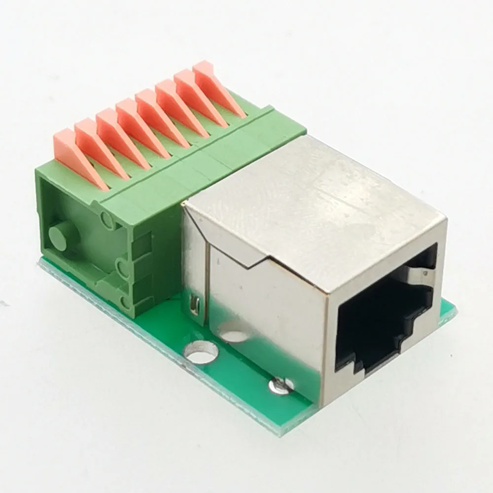 Experience seamless network connections with this 8P RJ45 terminal adapter board designed for precise, weld-free data wiring. Its industrial yet practical design ensures reliable performance in professional setups. The green circuit board provides a sturdy, clear background for the black female RJ45 socket with metallic contacts, offering a visually organized appearance that highlights its technical cleanliness. The board features bright orange terminal blocks with pink levers, allowing secure wire connections without soldering. Easy to install with guide rails and screws, this adapter emphasizes durability and convenience. Operating at multiple voltages—5V, 12V, 20V, and 30V—it ensures compatibility across various network environments, providing a versatile solution for professional wiring tasks and network configurations. Envision yourself effortlessly managing your connections with this highly functional adapter board.