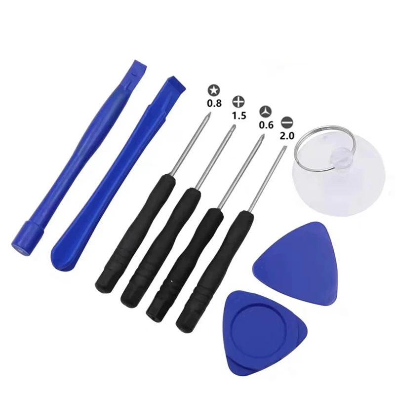 This comprehensive 9-piece phone repair and disassembly kit features a versatile 9-in-1 screwdriver and essential accessories, including a clear flexible plastic suction cup with a metal ring and various pry tools. The vibrant blue plastic pry tools are designed with smooth, curved, tapered tips for delicate opening tasks, while the precision metal screwdrivers have black textured handles for ergonomic grip and detailed screw removal. Ideal for safely opening, repairing, and maintaining mobile devices, this set combines clean lines, vibrant color accents, and functional design to ensure a professional repair experience. Trust in this carefully assembled toolkit to help you confidently handle your phone repair projects.