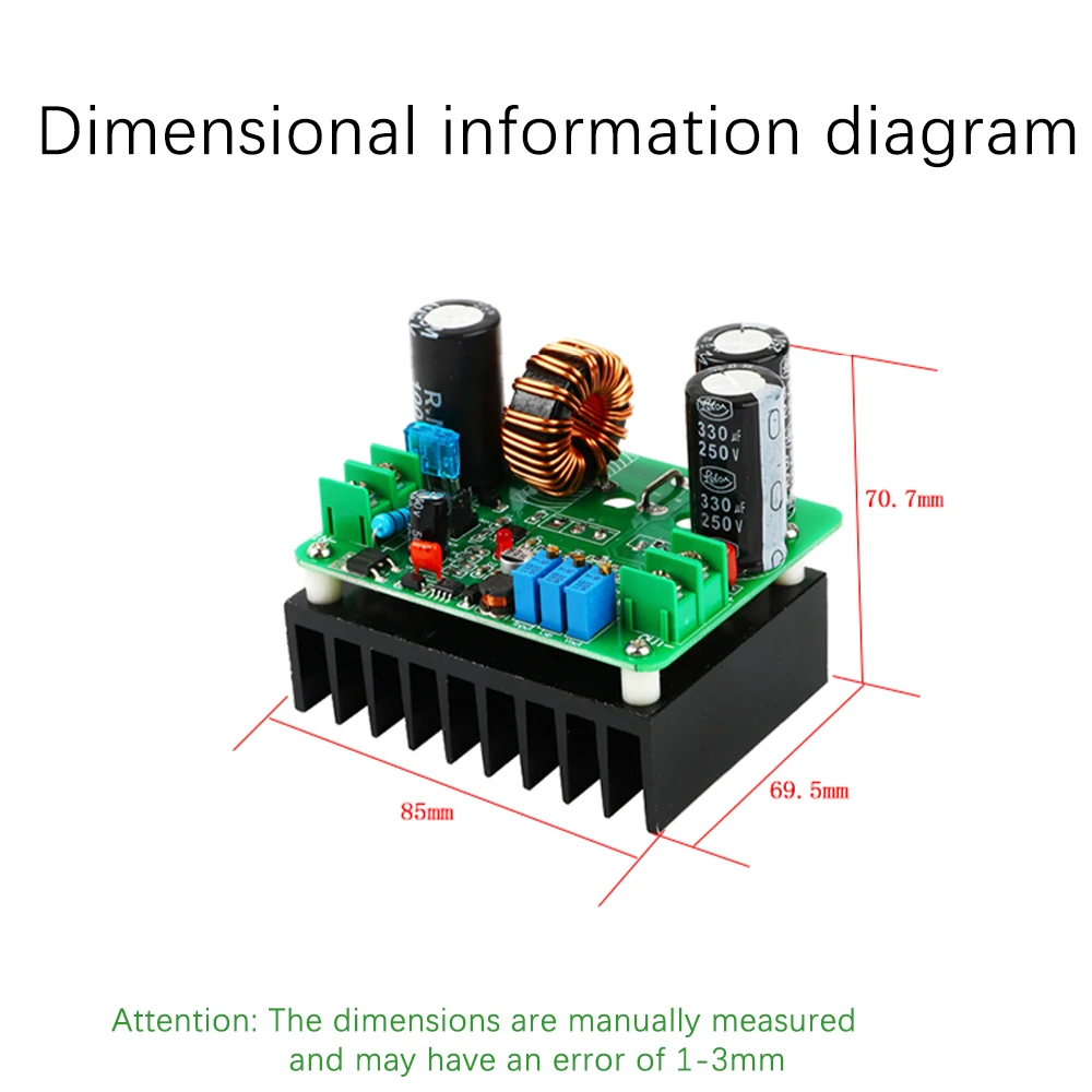 This high-power 900W DC-DC boost module features an adjustable output voltage range from 12V to 130V, capable of delivering up to 15A current with a maximum efficiency of approximately 85%. With a compact size of 85.0×69.5×70.7mm and weighing 275g, it includes durable input and output terminal blocks designed for high current load. The module offers precise voltage and current adjustments via onboard potentiometers, equipped with short-circuit protection, and operates within a temperature range of -10℃ to +75℃. Ideal for battery charging, solar power applications, high-power LED driving, and vehicle power supply systems, it utilizes high-quality components such as a 1mm double-wire wound inductor and premium filter capacitors to ensure stable, regulated output.