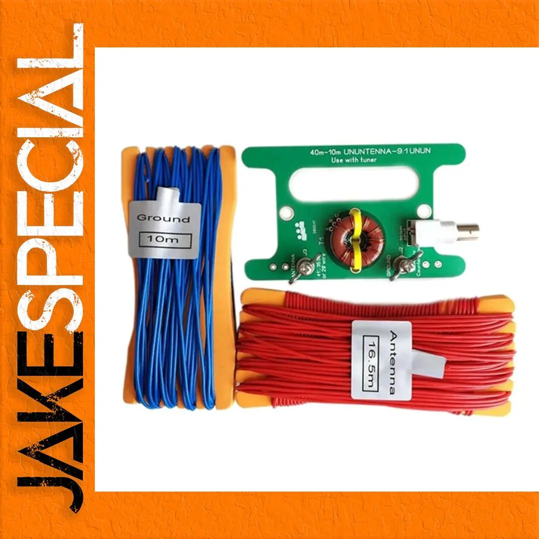 - Two bundled wires: 10m blue ground and 16.5m red antenna.