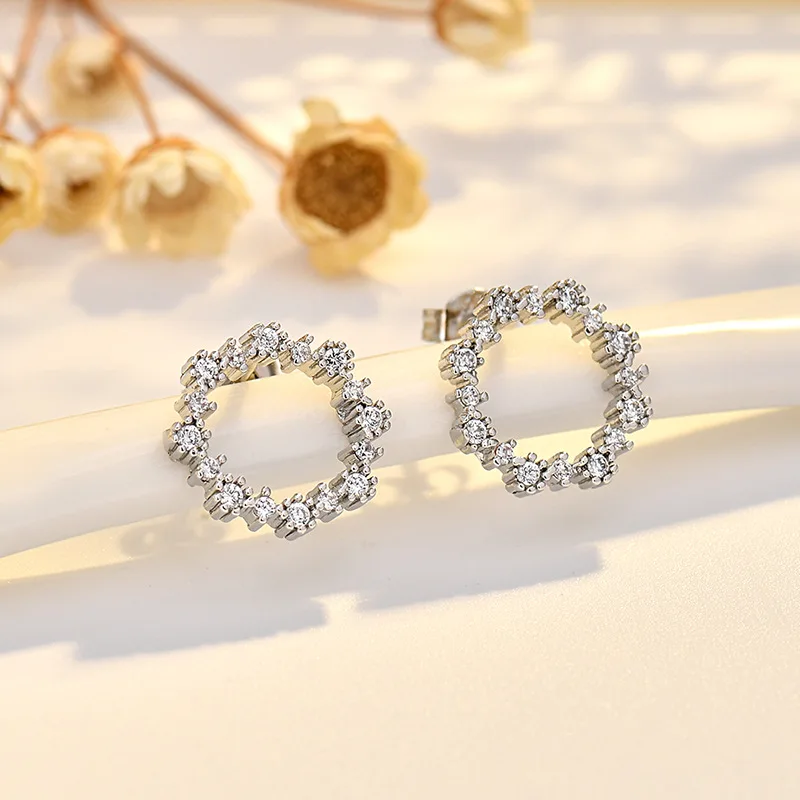 Imagine elevating your style effortlessly with this pair of this elegant silver stud earrings. Crafted from 925 silver and finished with a gleaming platinum coating, these earrings showcase a round shape densely decorated with sparkling cubic zirconia stones in a pave setting. Their luminous, tactile surface exudes sophistication, perfect for both casual and formal events like weddings, anniversaries, or special celebrations. With a weight of just 1.5 grams, they are comfortable yet luxurious accessories that catch the light beautifully from every angle. Whether you wear them for an everyday classy look or a glamorous evening, these earrings promise a radiant, refined appearance that complements any outfit.