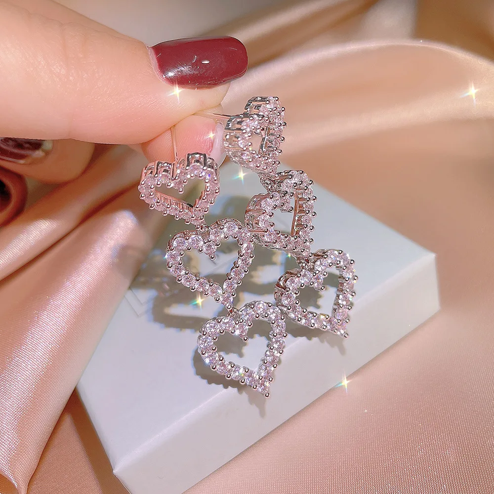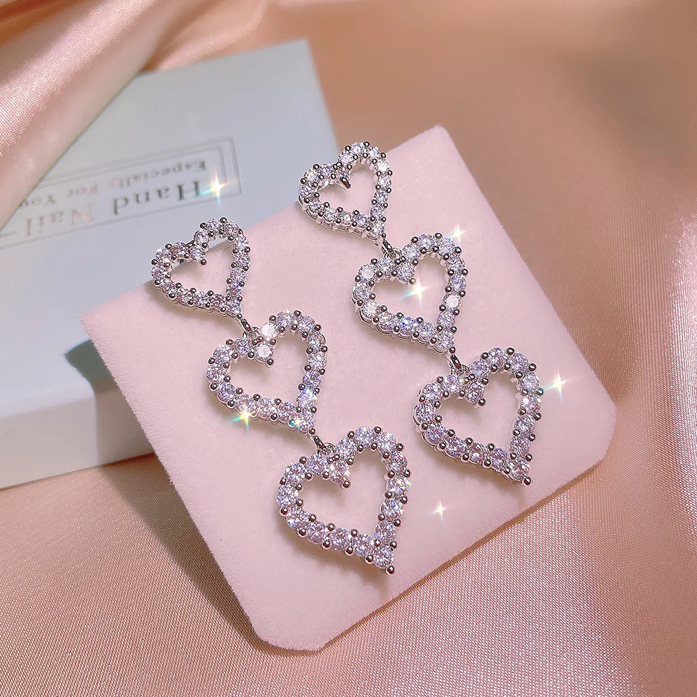 Enhance your elegant look with these delicate LL-YS0352 long drop earrings featuring three interconnected heart-shaped cubic zirconia stones outlined with sparkling accents. Weighing approximately 0.99 grams, these feminine earrings are crafted with a sleek silver needle and styled in a cute, romantic design perfect for wedding or special occasions. The shimmering cubic zirconia stones create a luminous border, adding a radiant touch to any outfit. Their lightweight, dainty silhouette makes them comfortable to wear while exuding a charming and sophisticated vibe. These fine jewelry pieces are ideal for women seeking a beautiful, romantic accessory to elevate their style.