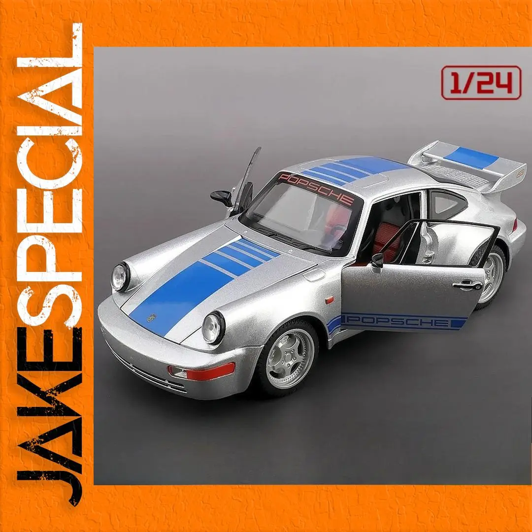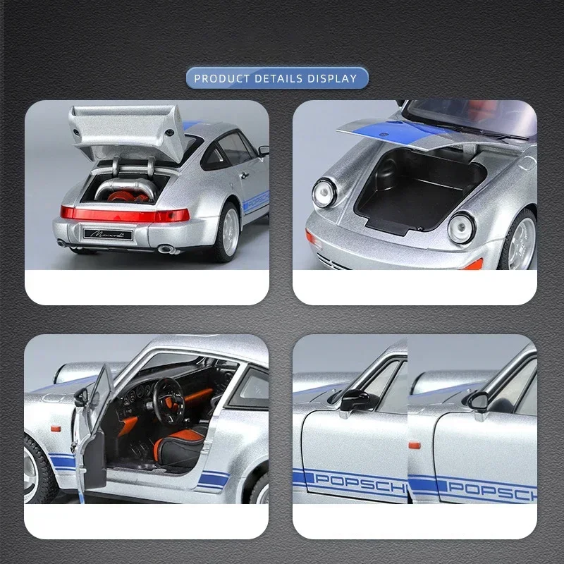 This 1:24 scale diecast model car represents the iconic 964 Carrera RS, crafted from a durable combination of alloy and plastic. It showcases a sleek silver exterior with striking blue racing stripes that enhance its sporty appearance, complemented by a vibrant red interior visible through the open doors. The model features interactive sound and light functions powered by a button battery, as well as striking five-spoke alloy wheels. Available in multiple colors, including blue, silver, and white, this detailed car is perfect for collectors and enthusiasts alike, capturing the essence of classic automotive design.