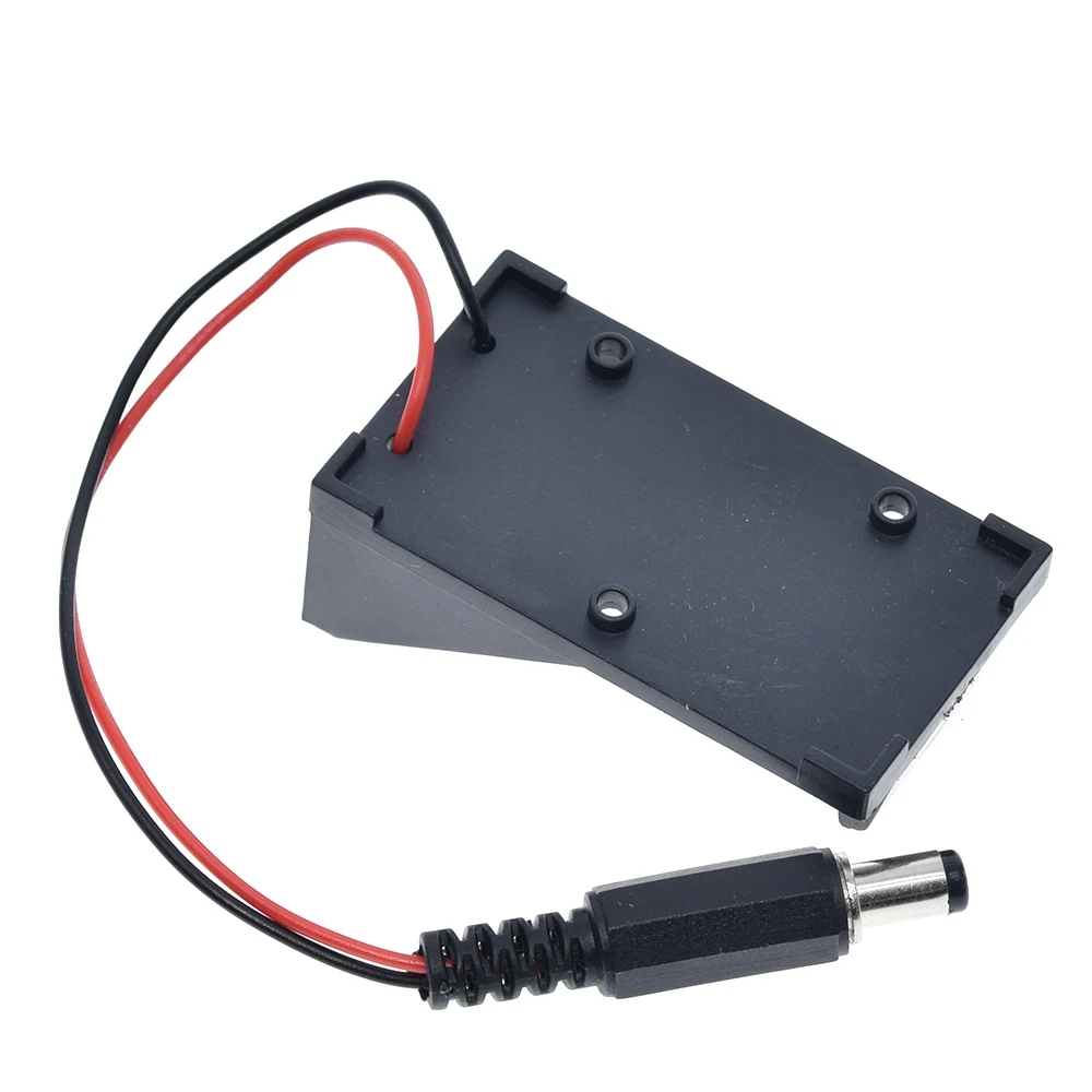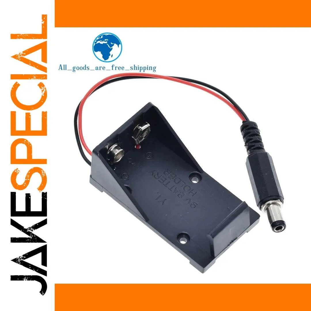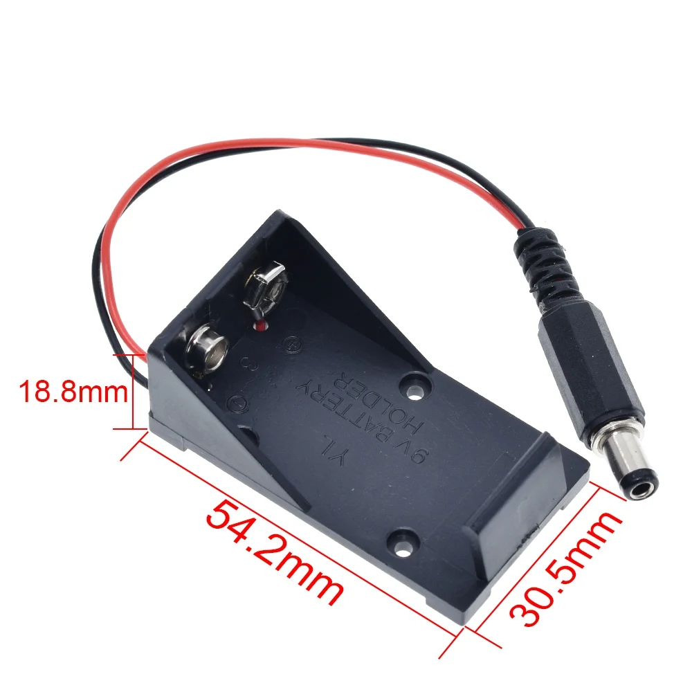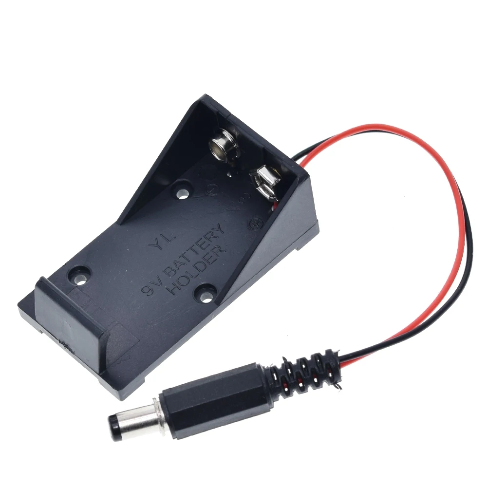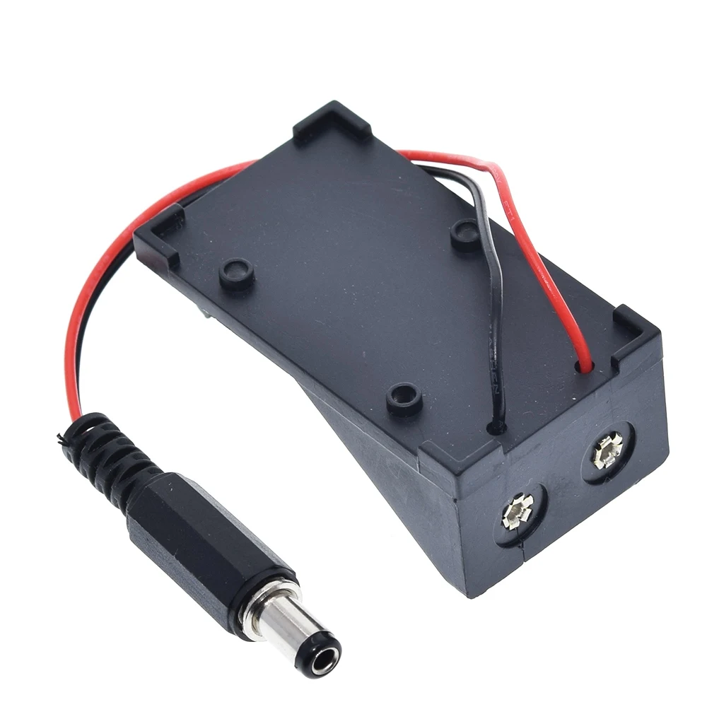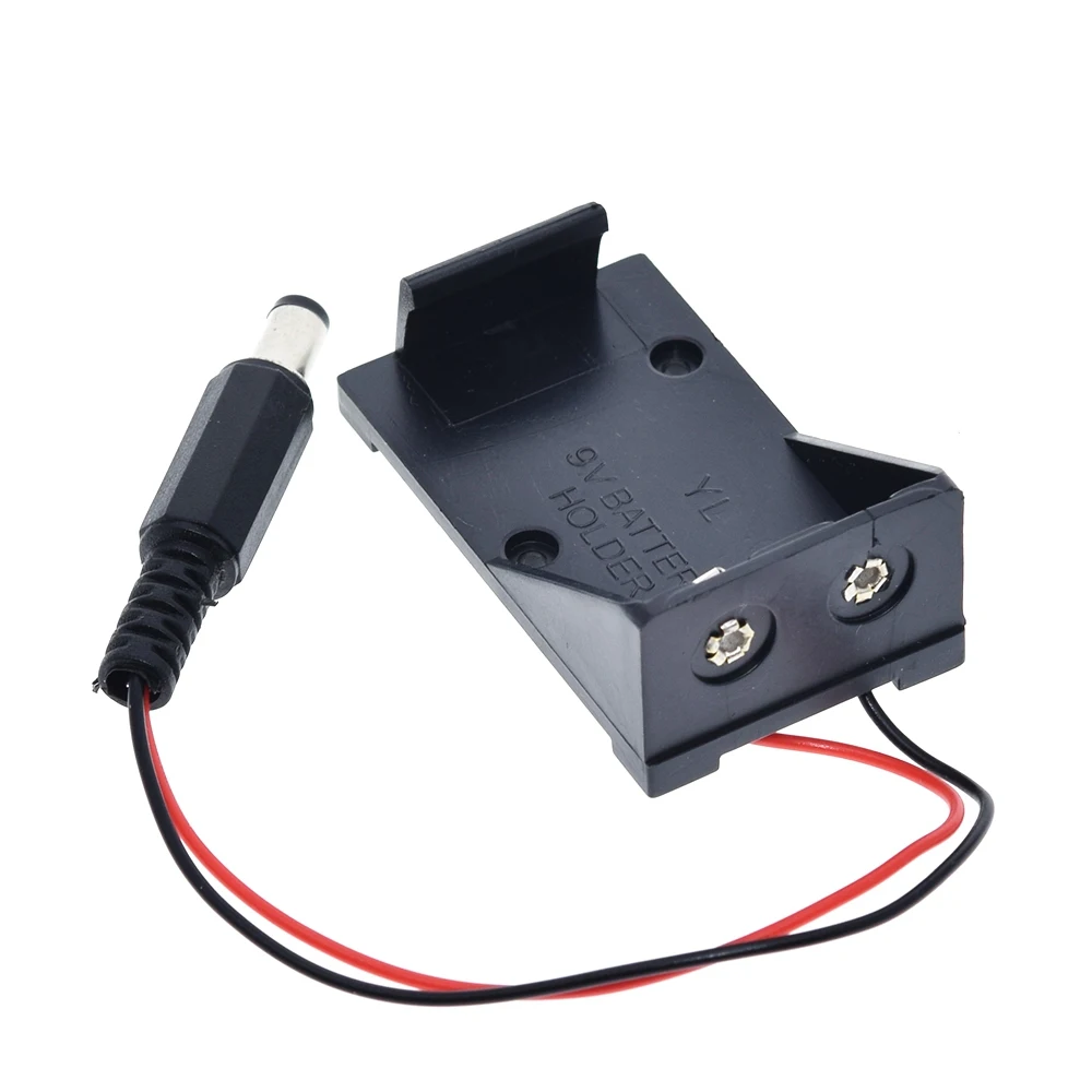 This durable 9V battery holder case combines black plastic and metal components, designed to securely fit 9V batteries with dimensions of 5.5 x 2.1 mm. Available in 1 or 3-piece sets, it features a sleek, utilitarian design with embossed markings and corner punch holes for easy mounting. The included red and black wire terminates in a cylindrical plug with a black ribbed insulating sleeve and a metallic tip, ensuring convenient connection for electronic, DIY, switch, or sensor projects. Perfect for supporting voltage regulation and electronic modules, this high-quality holder is ideal for customizing and enhancing your electronic setups.