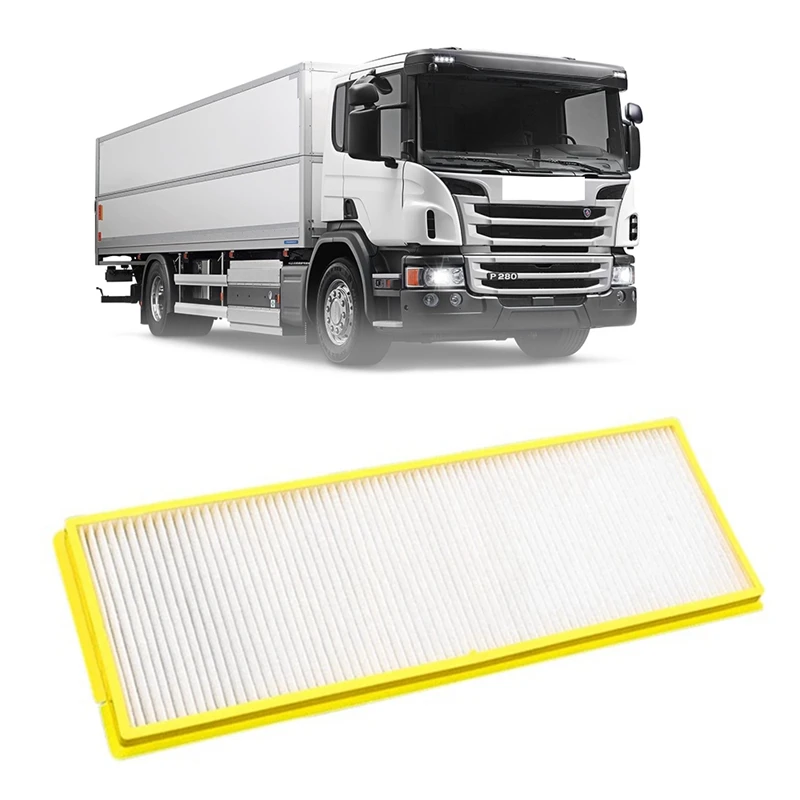 This set of five A/C filters is designed specifically for Scania trucks, featuring part numbers 1770813, CU37001, and 1913500. Each filter has a robust yellow plastic frame surrounding a white pleated filtration media, which is engineered for high dust holding capacity and uniform airflow distribution. The filters provide high filtration efficiency with low flow resistance, ensuring optimal performance. Made from high-quality filter paper, these brand new filters are durable and easy to install, making them a reliable choice for enhancing your truck’s air conditioning system efficiency.