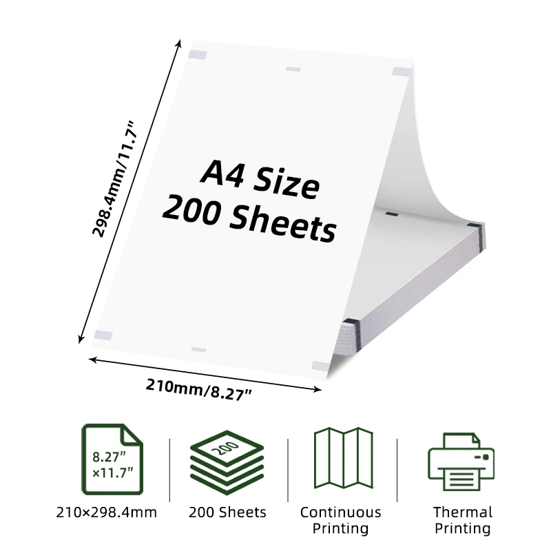Experience efficient printing with this set of 200 A4 thermal folding paper sheets, each measuring 210mm in width and 298mm in length, designed for use with portable printers. Crafted with a smooth, high-quality finish, these sheets are perfect for creating clear, detailed data visualizations such as line graphs and charts, ideal for professional or personal projects. The thermal folding design ensures neat, folded edges for easy handling and storage. Free from concerning chemicals, this paper offers a safe and reliable printing experience. Organize your information effortlessly with these crisp, white sheets, seamlessly fitting into your thermal printing workflow for consistent, high-quality results every time.