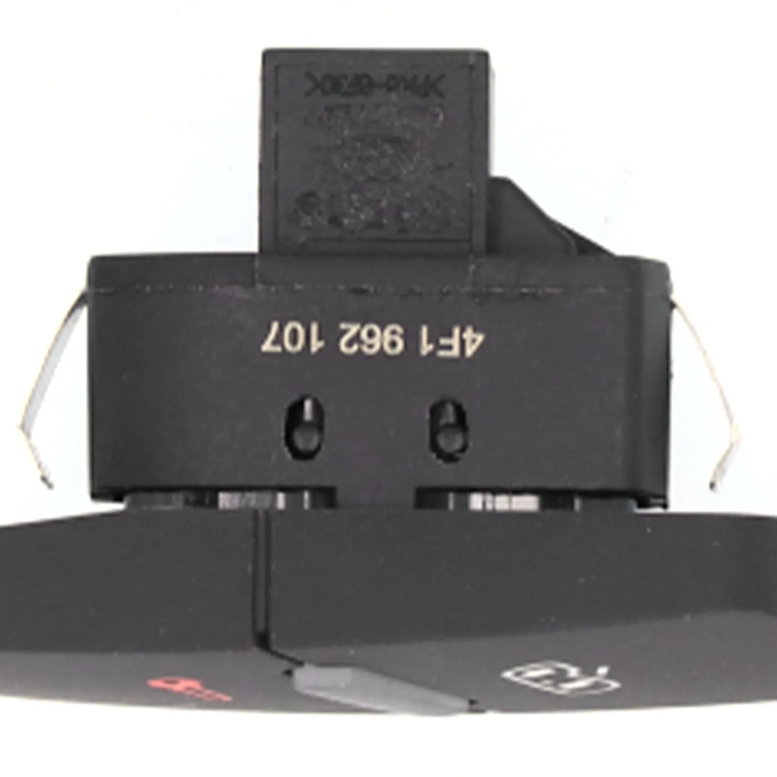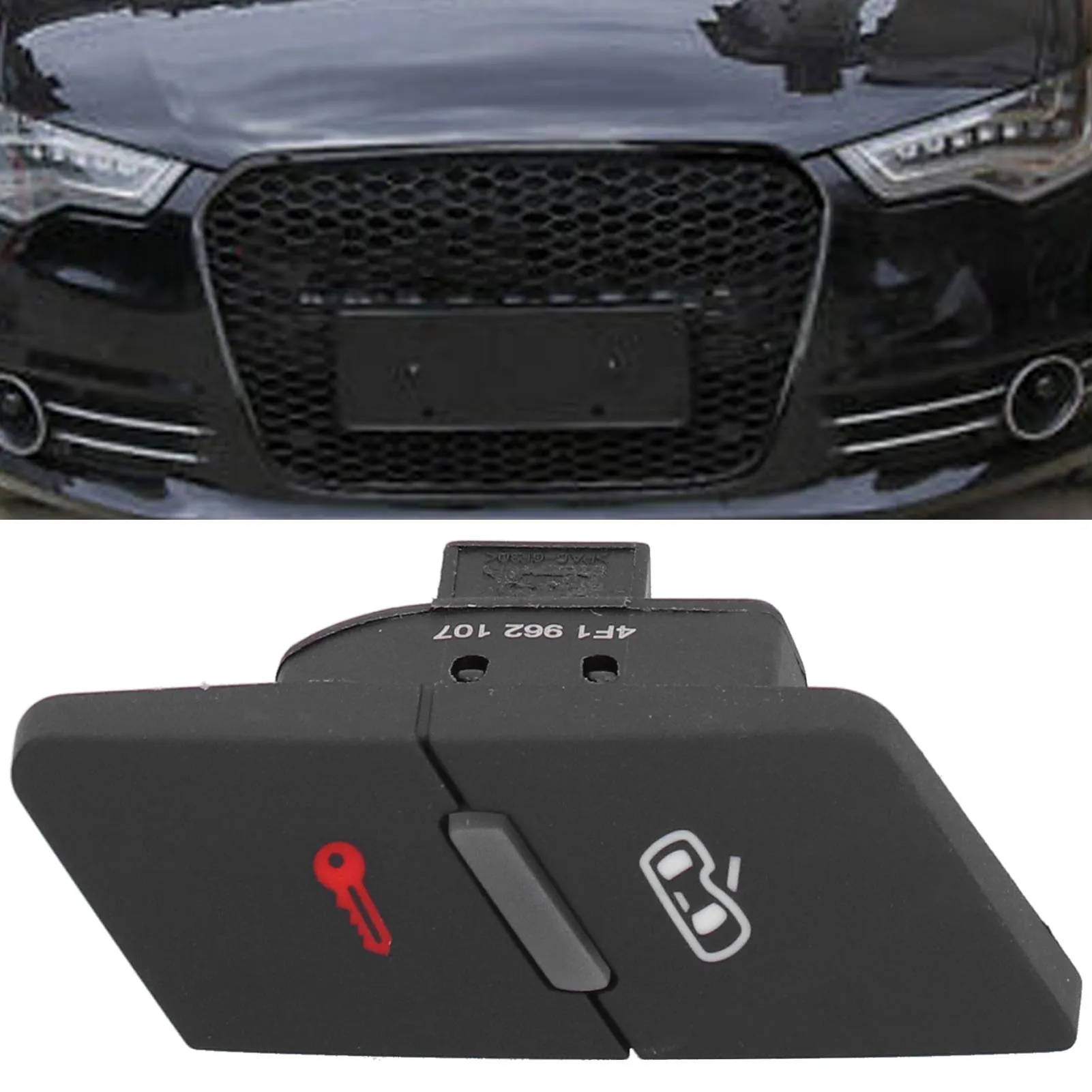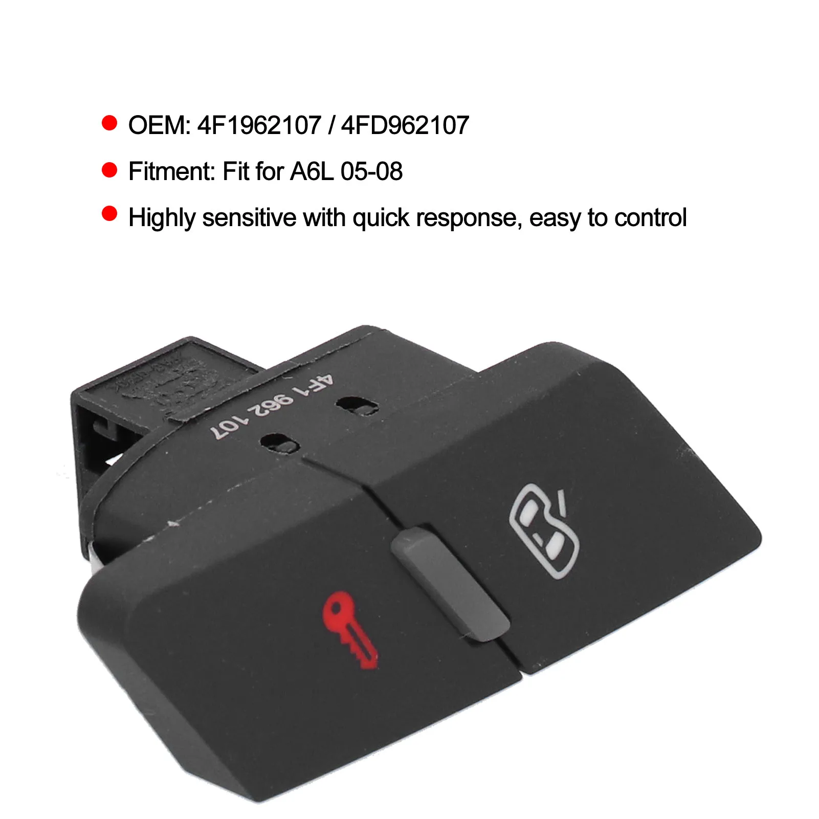 - Technical specifications include: Material—ABS Plastic, Compatibility—2005-2008 A6L, OE numbers—4F1962107 / 4FD962107, Compact rectangular shape, textured surface for grip, and responsive toggle mechanism.