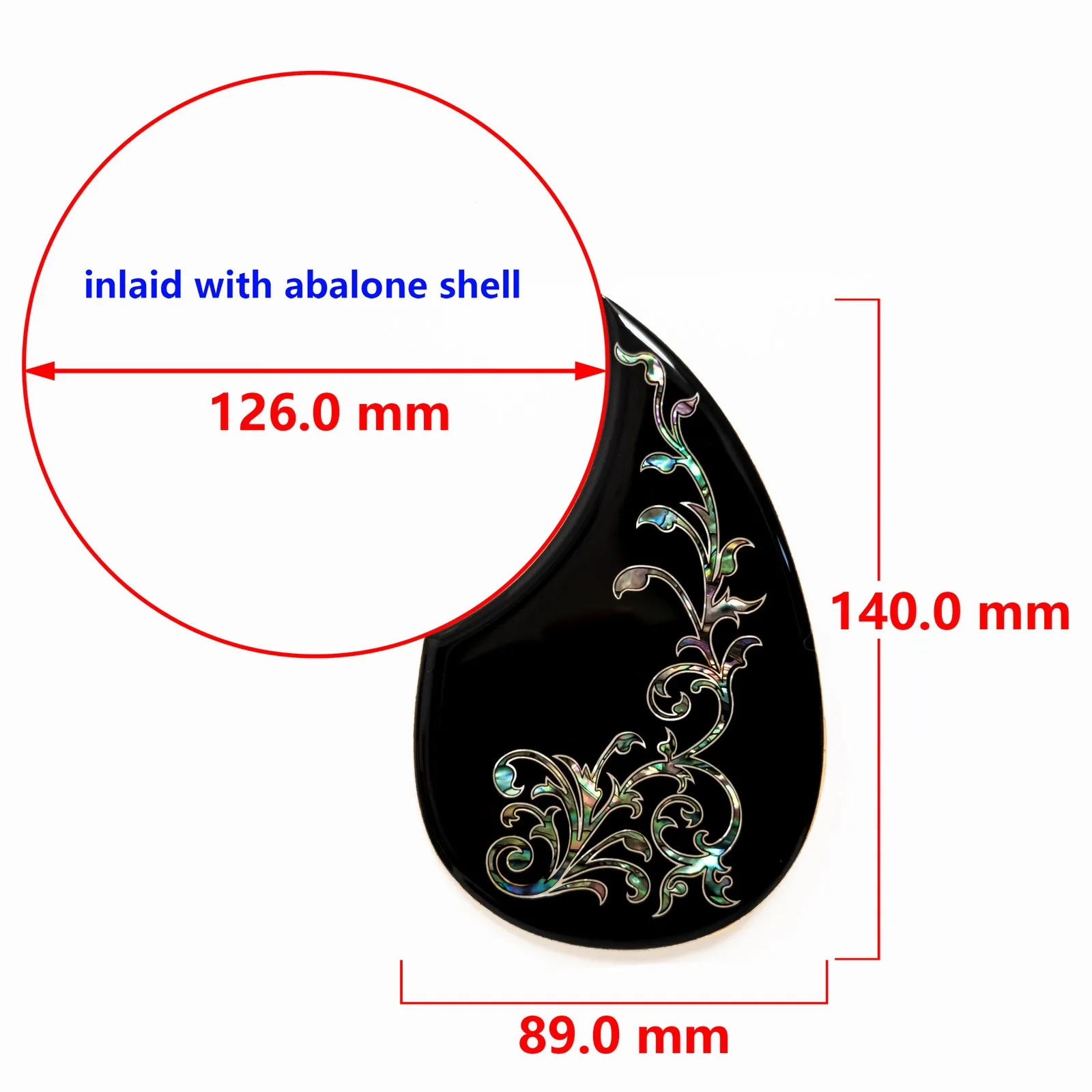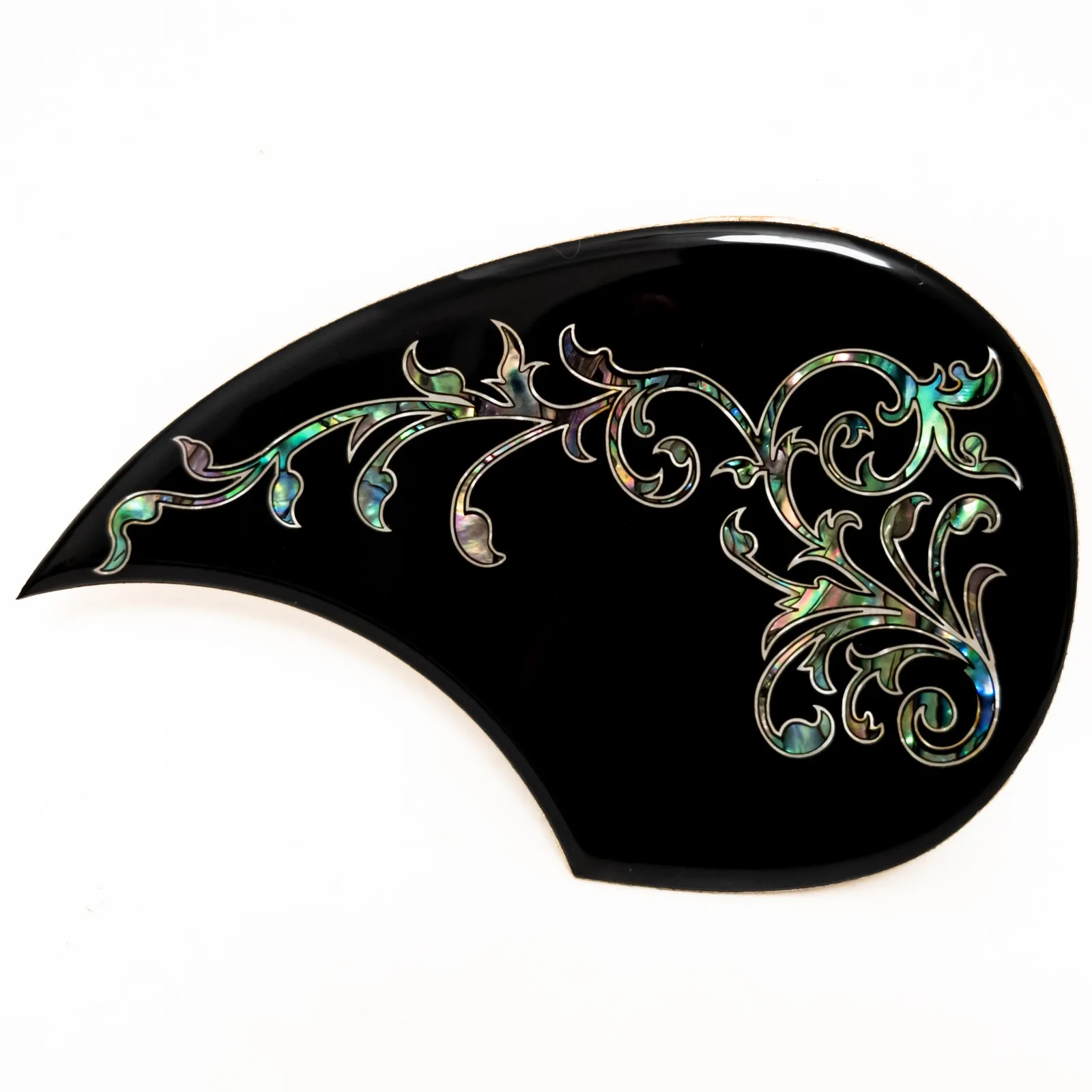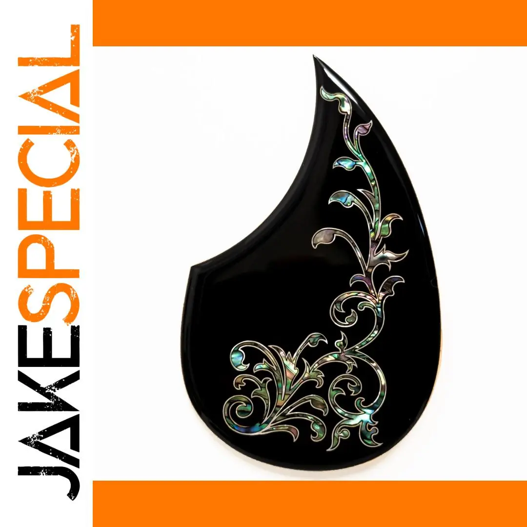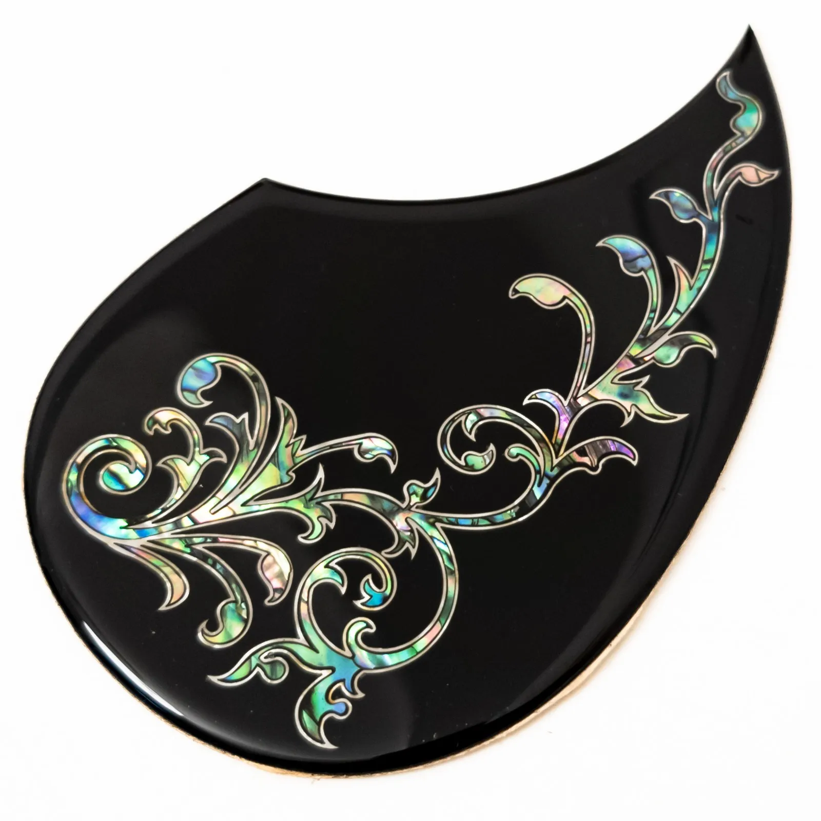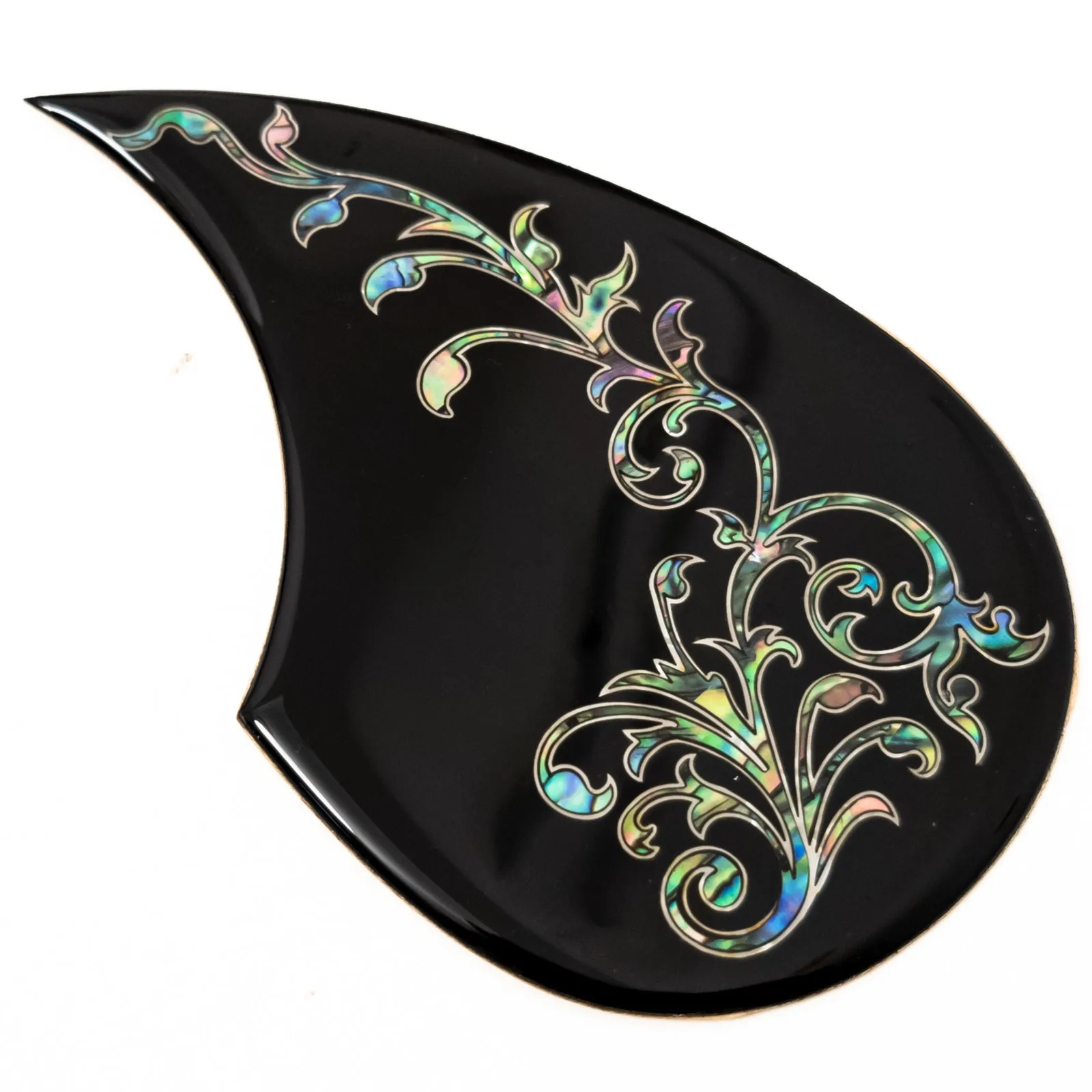 Transform your guitar’s look with this stunning pickguard, crafted from solid wood and featuring genuine abalone shell inlay. Designed for 36-40 inch acoustic guitars, it combines durability with artistic craftsmanship. The vibrant, multi-colored abalone inlay reflects light beautifully, creating a captivating visual effect that elevates your instrument’s aesthetic. Its meticulously handcrafted floral and vine motifs along a swirling pattern add a touch of elegance and sophistication. The glossy black surface offers a sleek backdrop for the shimmering inlay, while the beveled edges enhance its luxurious appearance. This pickguard not only protects your guitar but also adds a unique personal touch. Made with highest quality materials, it ensures a durable and beautiful custom upgrade for your cherished instrument.