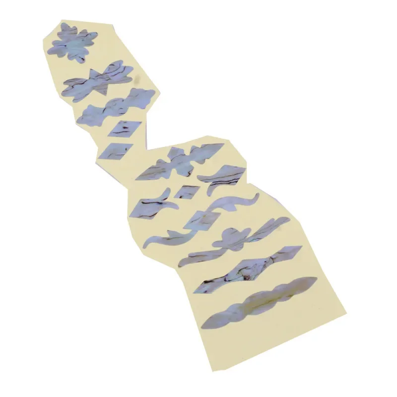 Transform the look of your guitar effortlessly with this set of imitation abalone fretboard inlay stickers. Designed to fit all standard guitar fret quantities from 19 to 24 frets on electric and acoustic models, these ultra-thin decals add a touch of elegance and uniqueness. Crafted from translucent PET plastic, they feature iridescent, pearlescent motifs such as flowers, bows, and swirling patterns, reflecting light with a stunning shimmer. Easy to install and remove, they won't interfere with your instrument’s sound quality. Whether you're customizing for performance or style, these stickers give your guitar an eye-catching upgrade that is simple to apply. Now, enjoy a more personalized and refined musical experience.