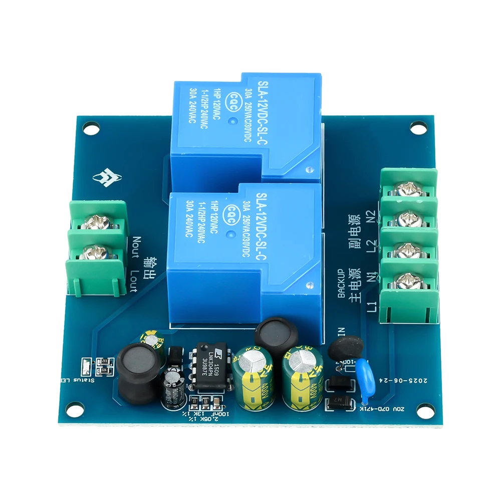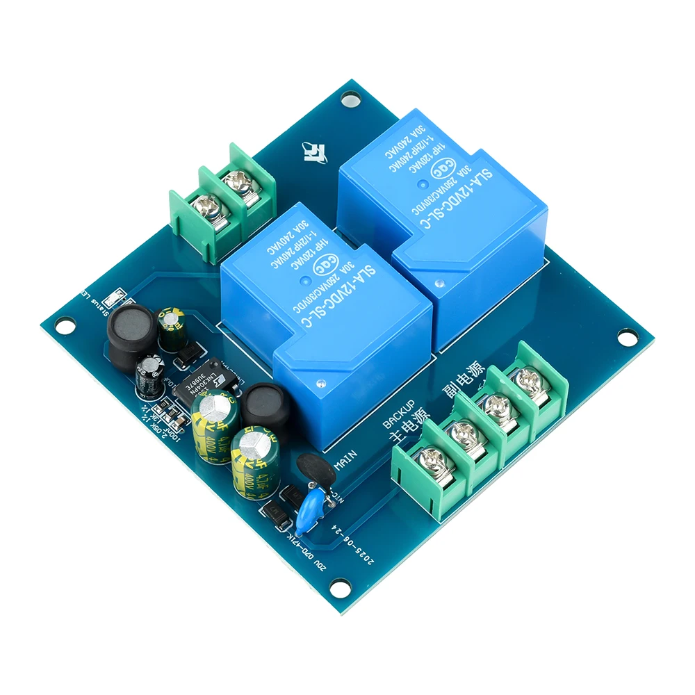 Imagine never worrying about power outages disrupting your equipment. This advanced AC 90-220V 2-Way Power Auto Transfer Switch Module seamlessly switches between your main and backup power sources within milliseconds. Its sleek, metallic greenish-blue rectangular PCB exudes a modern, industrial aesthetic, highlighted by two large, vivid blue rectangular relays that emphasize durability and functionality. Green terminal blocks with screw clamps ensure organized, secure connections for high-power appliances up to 30A. Small electrolytic capacitors and black ICs are subtly integrated, supported by crisp white labels for clarity. Install easily into various setups to enjoy continuous, reliable power, protecting your vital devices with precision engineering and effortless operation.