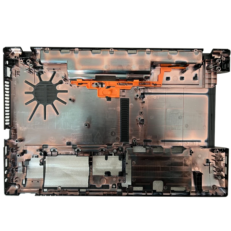 This bottom base case cover is designed specifically for Acer Aspire models V3, V3-571, V3-571G, V3-551G, V3-551, and V3-531, featuring part number AP0N7000400. It showcases a sleek black “D shell” color with a textured matte finish for added grip. Constructed from durable plastic, this lightweight yet sturdy cover includes necessary cutouts for cooling vents and ports, alongside a prominent orange indicator button. With multiple screw holes for a secure fit and visible grooves for ventilation, this case ensures functional protection for your laptop, making it an essential replacement for maintaining your device’s integrity.
