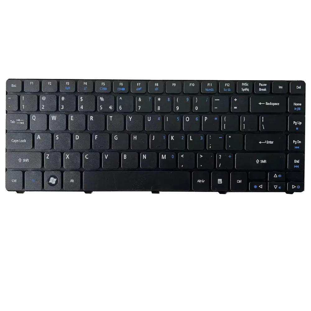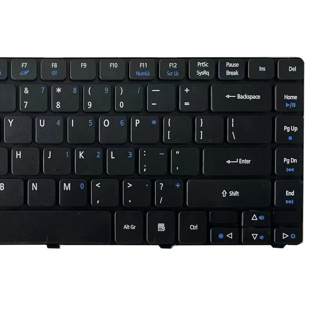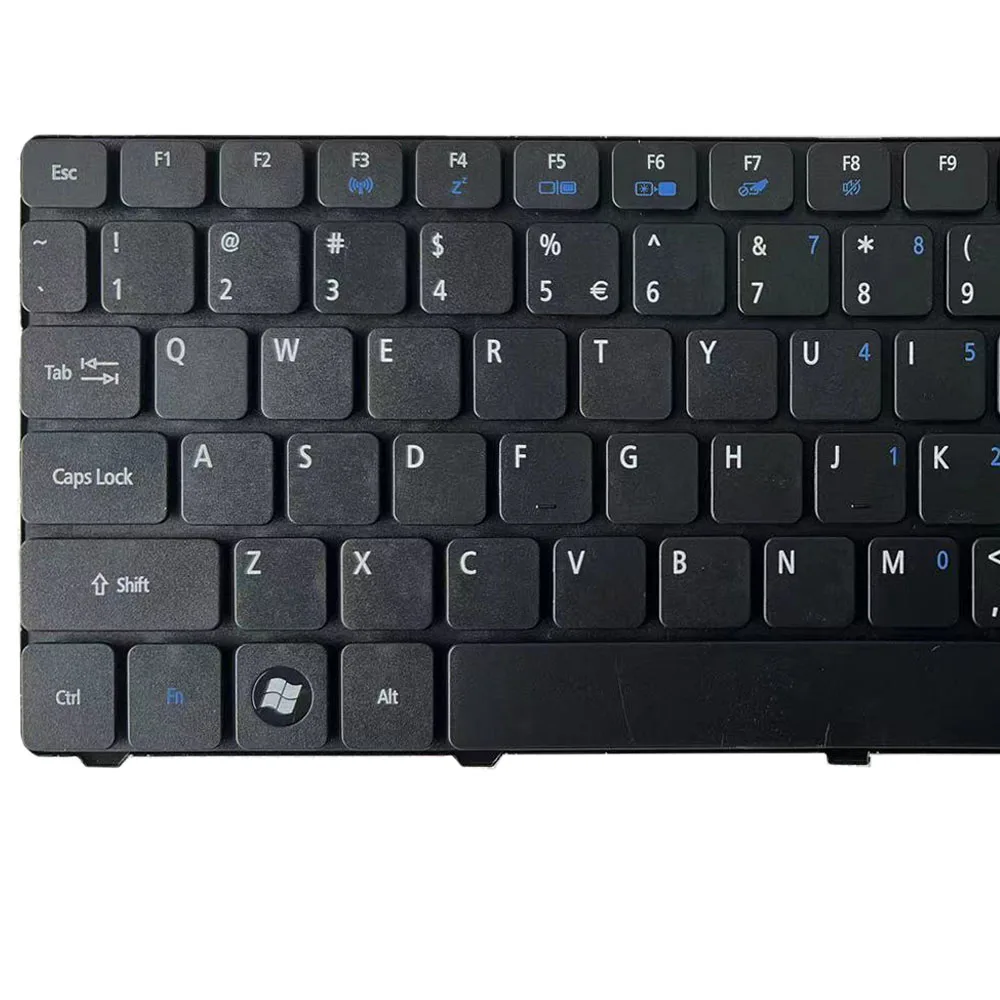 Experience a seamless typing experience with this high-quality replacement keyboard designed specifically for certain Acer Aspire models. Featuring a sleek matte black finish, it enhances your laptop's aesthetic with a modern, understated look. The rectangular keys with slightly rounded edges are labeled in crisp white, ensuring excellent readability. Some keys, like function and number keys, include small blue symbols for secondary functions, adding subtle accents. The layout includes a wide spacebar, large Enter, and clearly defined Shift keys, providing both style and comfort. The durable metallic backplate contrasts elegantly with the matte surface, ensuring longevity. Connector ribbon cable extends naturally from the center, making installation straightforward. This keyboard guarantees an optimal and stylish upgrade for your Acer Aspire laptop.