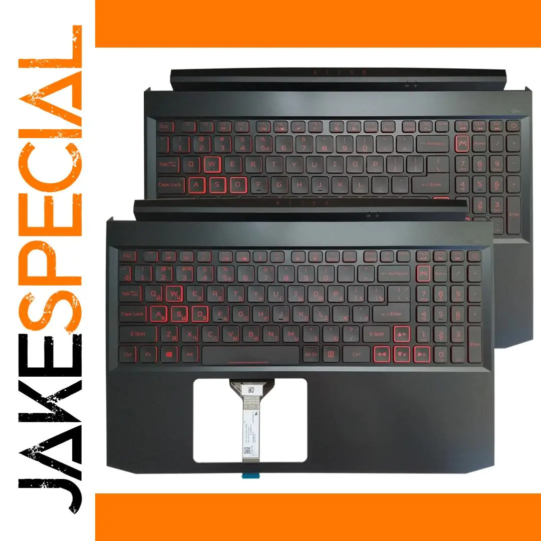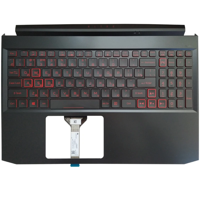 Elevate your gaming setup with this sleek Acer Nitro 5 keyboard top cover and palmrest assembly, designed specifically for models AN515-57 and AN515-45. Crafted from durable plastic with a matte black finish, it features a modern, minimalist look that combines style and functionality. The keys are slightly rounded, with a matte texture that enhances comfort during extended use. The layout includes a numeric keypad and bilingual labels in Russian and US English, with distinctive red outlines around the keys and vibrant red backlighting for a bold visual effect. This replacement part not only upgrades your device’s appearance but also ensures reliable performance, giving you confidence that your laptop will have a high-performance, stylish keyboard setup ready for intense gaming sessions or productive days.