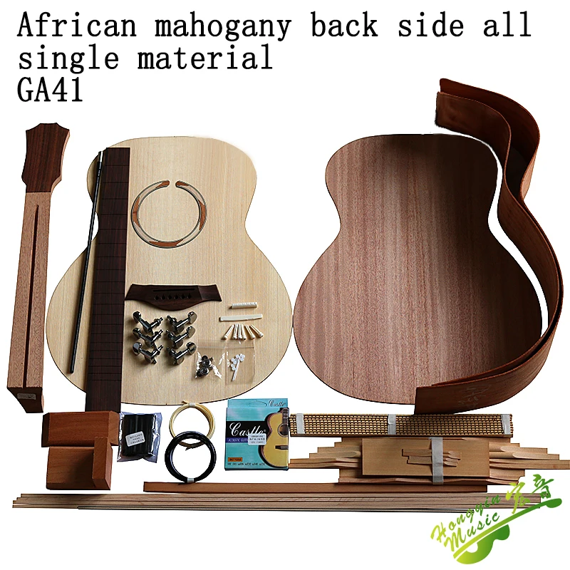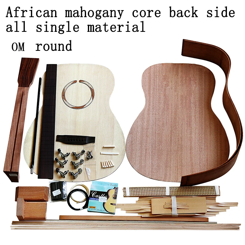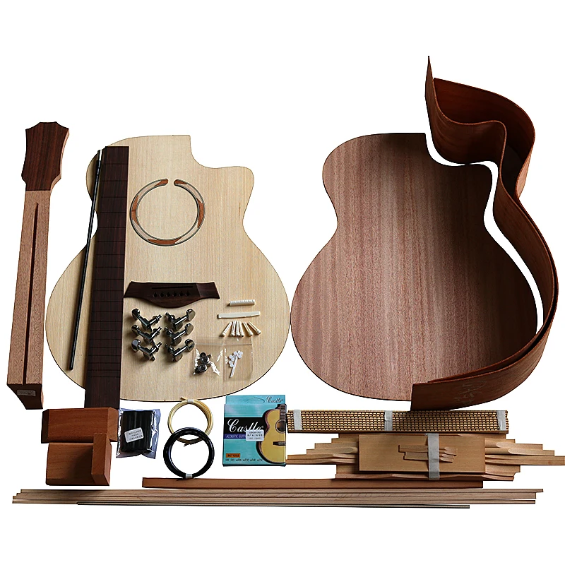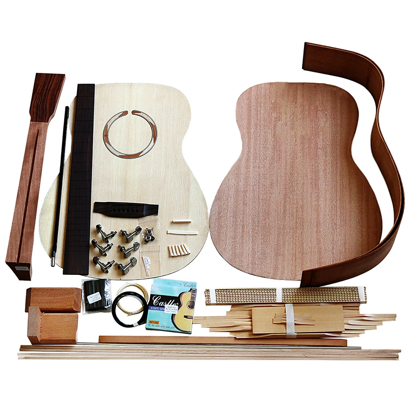 Imagine bringing your musical dreams to life with this stunning acoustic guitar making kit. Designed for DIY enthusiasts and seasoned craftsmen alike, this set offers everything you need to create a beautiful 40-inch OM or a 41-inch dreadnought guitar. The natural, warm tones of the solid spruce top and khaya sides and back provide a rich, earthy aesthetic that highlights the organic beauty of wood grains. The intricate components, from the Indian rosewood fingerboard and bridge to the Spanish-style handle, combine to support a classic, timeless sound and look. Whether you’re a hobbyist or a professional, this kit empowers you to craft a one-of-a-kind instrument infused with your personal touch.