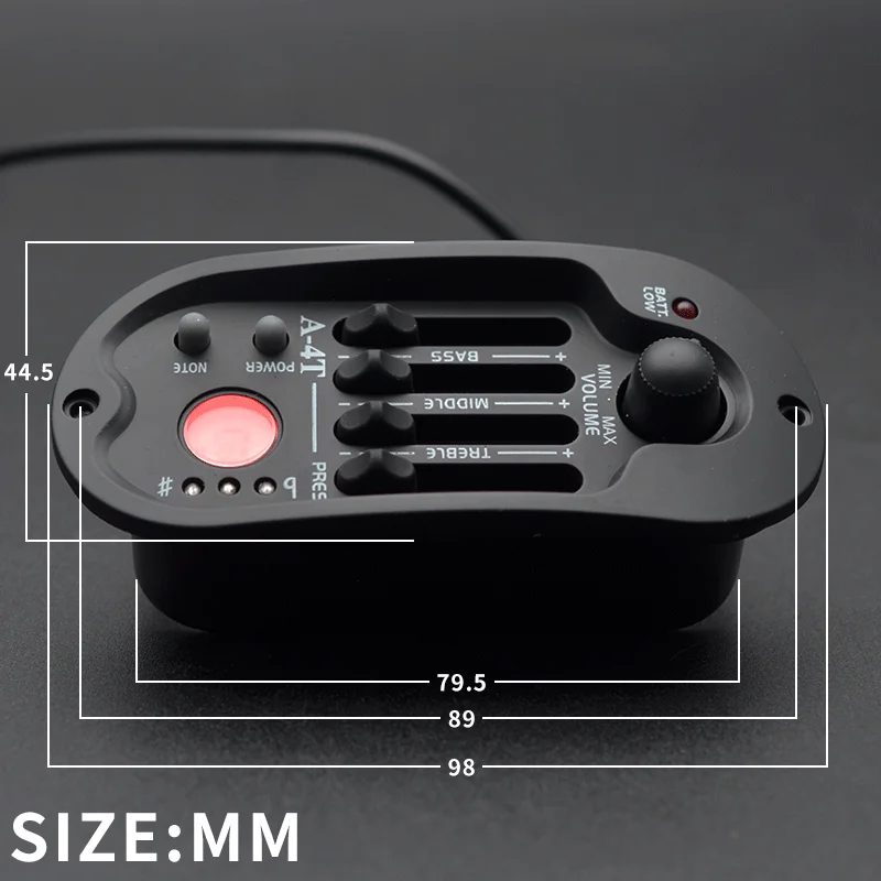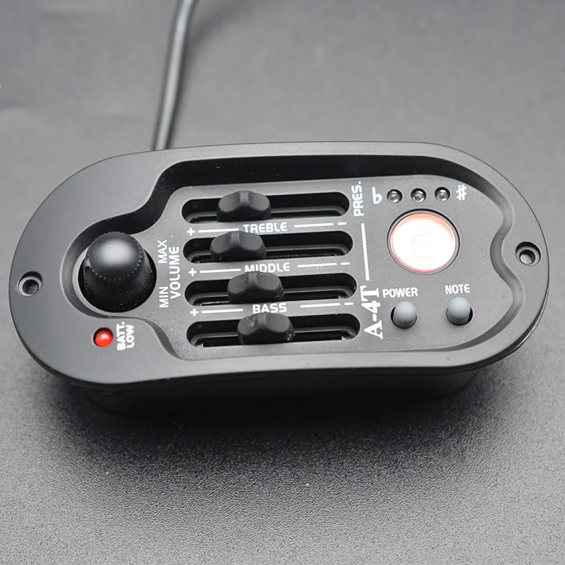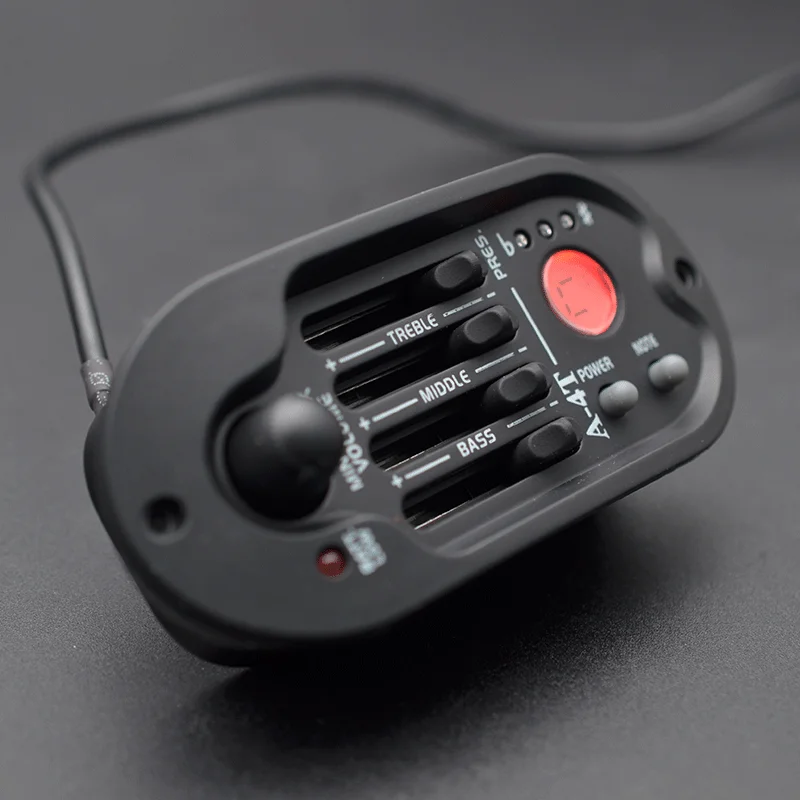Experience the ultimate control over your folk guitar’s tone with this sleek, black Acoustic Guitar Preamp A-4T. Its elongated oval design provides a modern, minimalist aesthetic that fits comfortably on your instrument. Crafted from durable plastic and electronic components, it combines style with functionality. The large volume knob and four precise sliders allow you to fine-tune your sound across treble, middle, bass, and presence frequencies, each adjustable by ±12dB at specific key points. The built-in LCD tuner with orange backlight makes tuning quick and easy, while the automatic low battery indicator ensures you're always ready to perform. Lightweight and portable, this preamp transforms your guitar into a professional-level instrument on stage or in the studio.