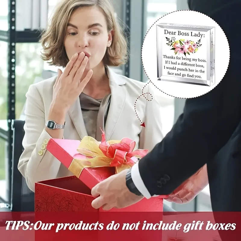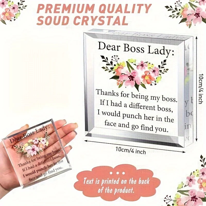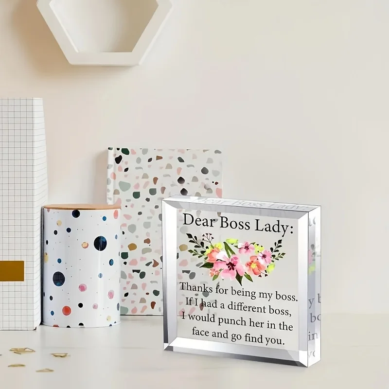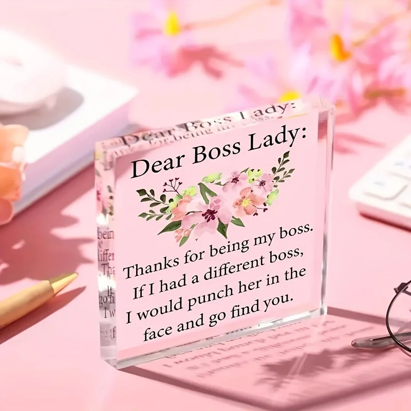 Celebrate your appreciation with this elegant heart-shaped acrylic desk plaque, crafted from durable, chemical-free plastic. Designed as a thoughtful gift for Boss’s Day or to honor a female boss, it features a clear, sleek surface with beveled edges for a modern touch. The vibrant floral illustration of pink flowers with green leaves and yellow accents, paired with humorous and appreciative black text, makes it a perfect desk accessory that balances playful charm with sophistication. Its transparent design allows versatile display on any workspace, adding a personal and stylish touch to your office decor and reminding your boss of your gratitude every day.