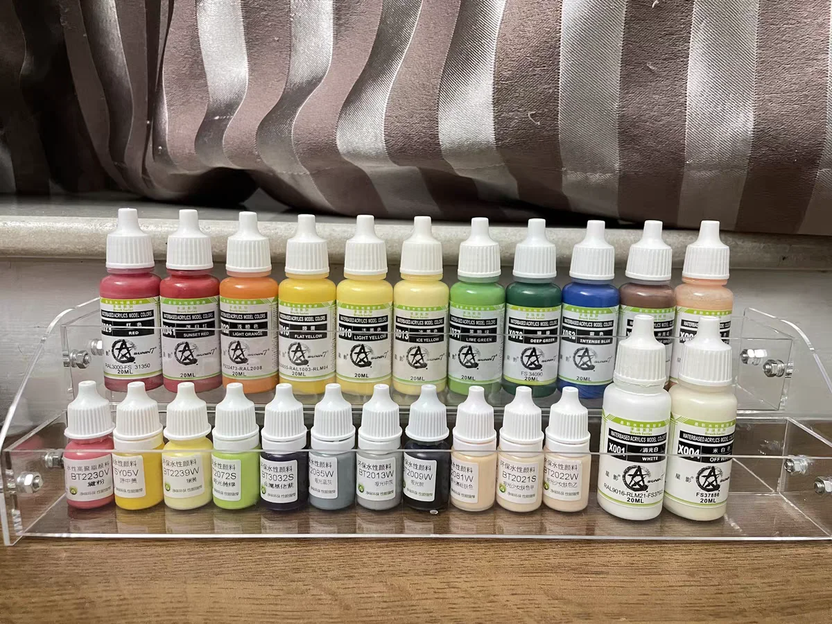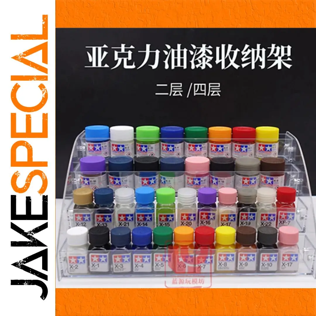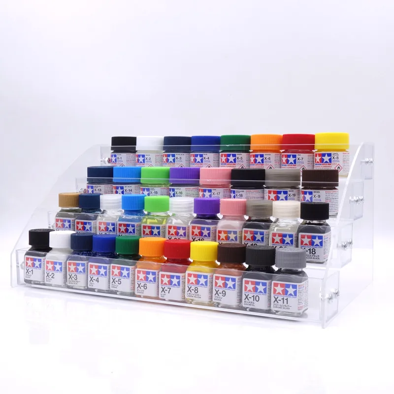 This transparent acrylic storage rack is uniquely designed to enhance your model-making experience by providing a sleek and practical solution for organizing your paint bottles. Its multi-tiered structure offers easy access to a variety of colors, displaying your collection beautifully. The sloped tiers maximally display paint bottles from trusted brands like Tamiya and Mr. Hobby, ensuring visibility and convenience. This rack transforms your workspace into an organized haven where creativity flows seamlessly, making those vibrant shades like blue, green, and orange easily accessible. Elevate your hobby by showcasing your paint collection while keeping it tidy and visually appealing.
