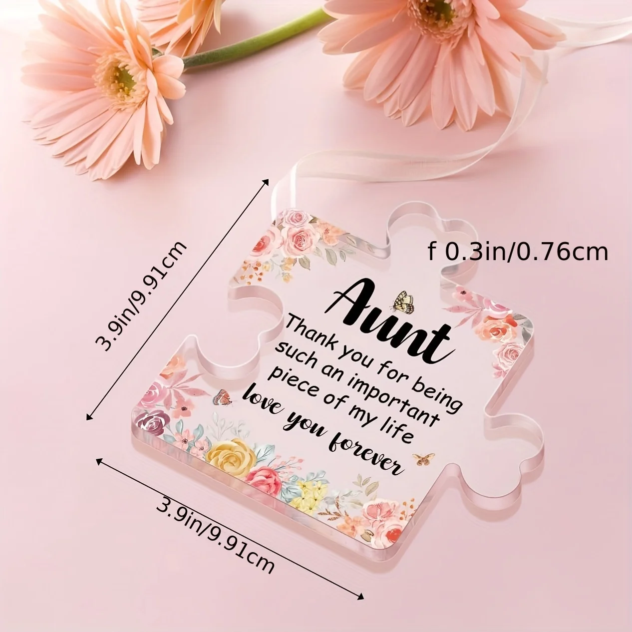 Bring this adorable acrylic puzzle plaque into your home or workspace to celebrate your wonderful aunt or to brighten her day. Its personalized design and beautiful details will surely be cherished. Whether as a meaningful gift or a personal keepsake, this decorative piece blends craftsmanship with heartfelt sentiment. Imagine her joy when she receives this charming, elegant sign that symbolizes your loving relationship. With high-quality acrylic and a splendid floral motif, it’s a timeless addition that will stand out and be treasured for years to come. Don't miss the chance to create memorable moments—order today!