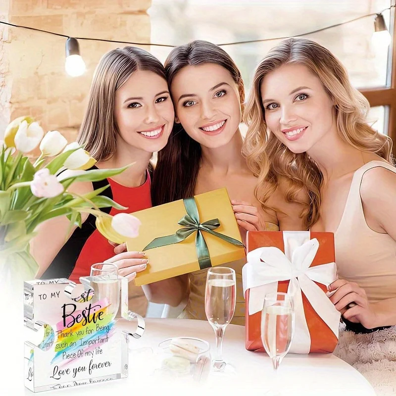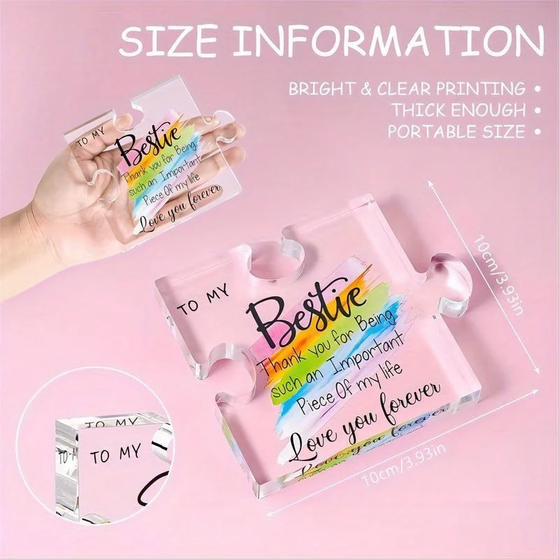 Enhance your special moments with this stunning acrylic puzzle plaque, crafted from high-quality acrylic material and available in three vibrant color options: A, B, and C. Its sleek, modern square design features puzzle-piece edges that interlock seamlessly, adding a unique touch to any decor. The front displays a colorful watercolor-inspired background in pink, yellow, green, blue, and purple, overlaid with an elegant heartfelt message in stylish cursive and playful handwritten fonts, with the word “Bestie” boldly emphasized. Perfect for celebrating birthdays, weddings, engagements, Thanksgiving, or Christmas, this meaningful desk accessory is an ideal gift for adults aged 18 and above, symbolizing love and appreciation.