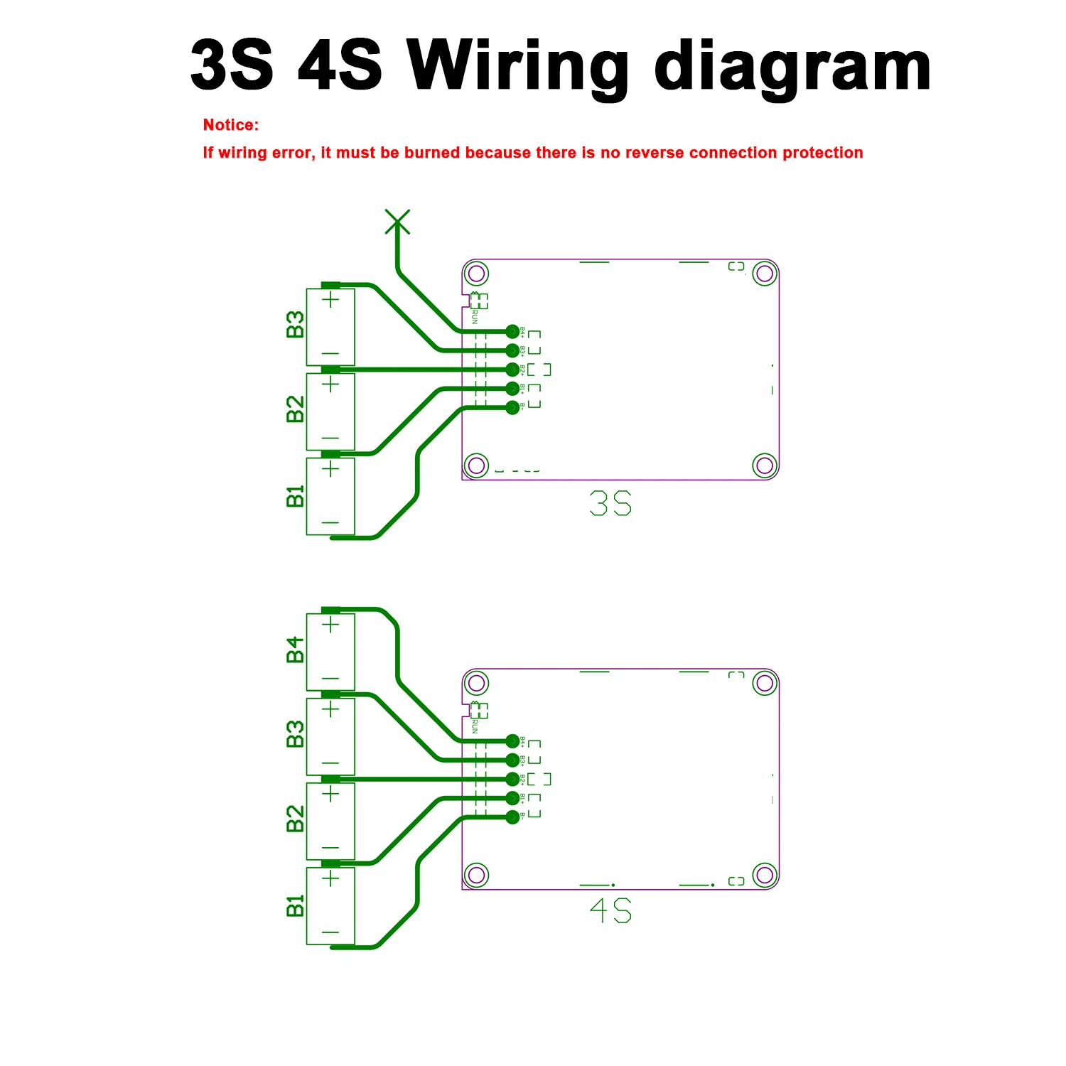 - No reverse connection protection or integrated safety functions, requiring the use of a separate protection board to ensure safe operation; external switches can control the balancing process manually.
