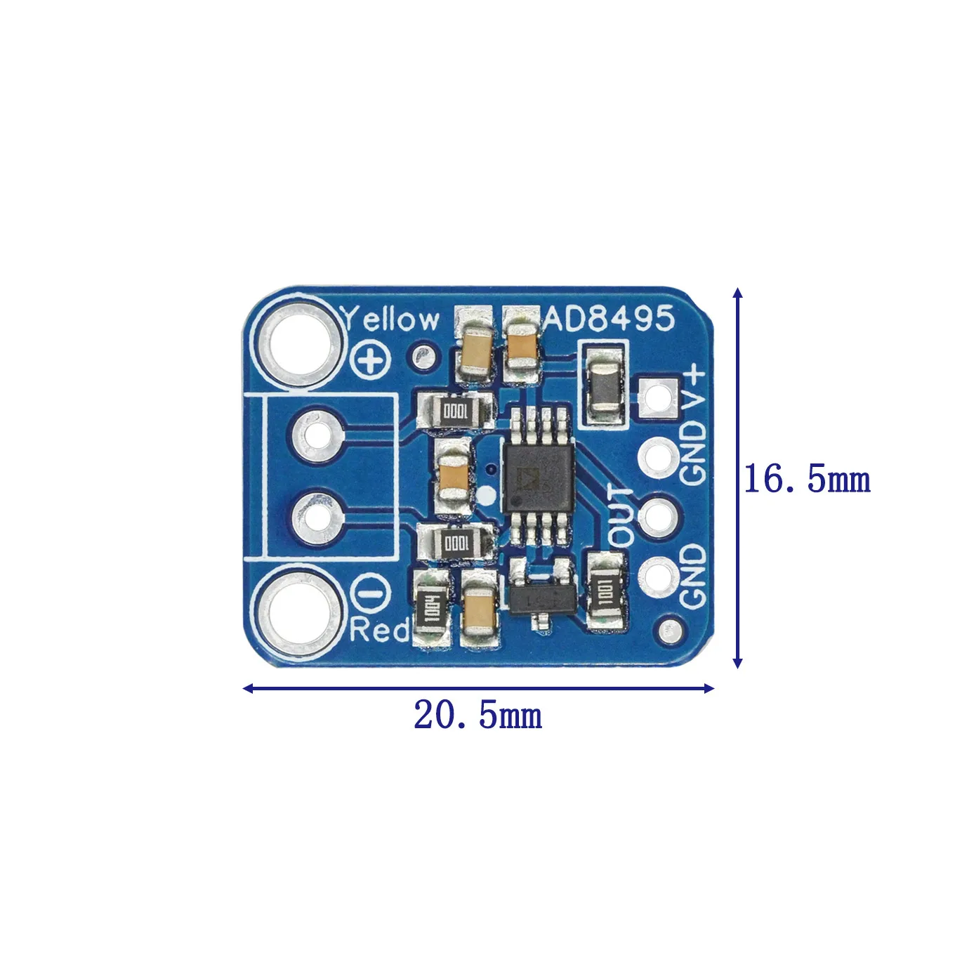 This AD8495 thermocouple amplifier module features a compact blue circuit board with clearly labeled connection points for V+, GND, and analog output, designed specifically for type K thermocouples. Powered by 3.3V to 18V DC, it provides an output voltage proportional to temperature, ranging from -250°C to +750°C at 5V supply or -250°C to +410°C at 3.3V supply, with an output spanning 0 to 5VDC or 0 to 3.3VDC respectively. The module includes screw terminals for connecting the thermocouple wires (red and yellow), and features mounting holes at each corner for easy installation. Its precise design makes it ideal for accurate temperature measurement in a variety of electronic projects and industrial systems.