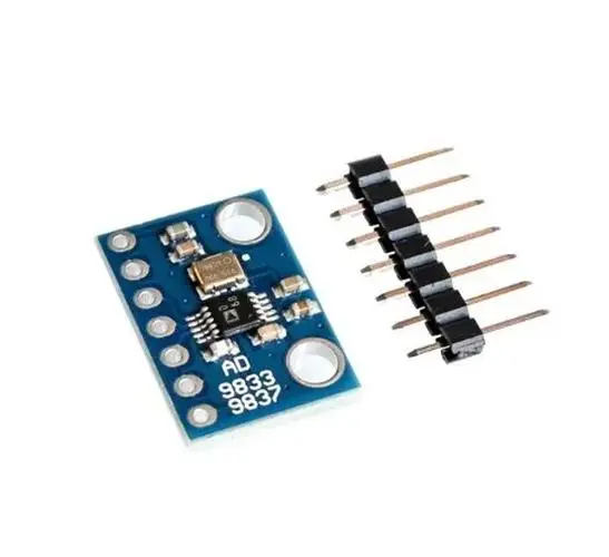 Experience precise waveform generation with the AD9833 Programmable Microprocessors Serial Interface Module, designed for seamless integration into your electronic projects. This compact module features a vibrant blue PCB (also available in red) with a central black integrated circuit, a gold-colored rectangular component, and white silkscreen markings that ensure clear identification. Equipped with six silver through-hole pads and an 8-pin metal pin header, it allows easy connection to microcontrollers for generating high-quality sine and square waves via Direct Digital Synthesis (DDS). Ideal for signal processing, testing, and measurement applications, this new-condition module combines a sleek aesthetic with advanced functionality.