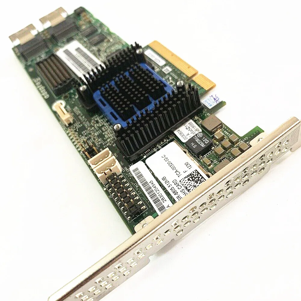 Experience enhanced storage capacity with this high-performance Adaptec ASR-6805 RAID expander card. Built with a sleek, industrial design, it features a vibrant green PCB decorated with meticulously arranged electronic components. The standout black chip socket, crowned by a bright blue heatsink, adds a bold visual contrast, emphasizing its technological elegance. The gold-plated contacts along the edge sparkle with a metallic shine, indicating durability and quality. Reinforced with a brown plastic edge grip, and equipped with a sturdy metal bracket with ventilation holes, this card combines a modern aesthetic with functional design. It's perfect for professional server and storage system upgrades, seamlessly integrating into your existing setup with reliability and style.
