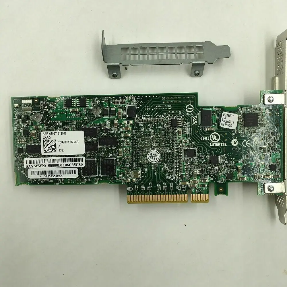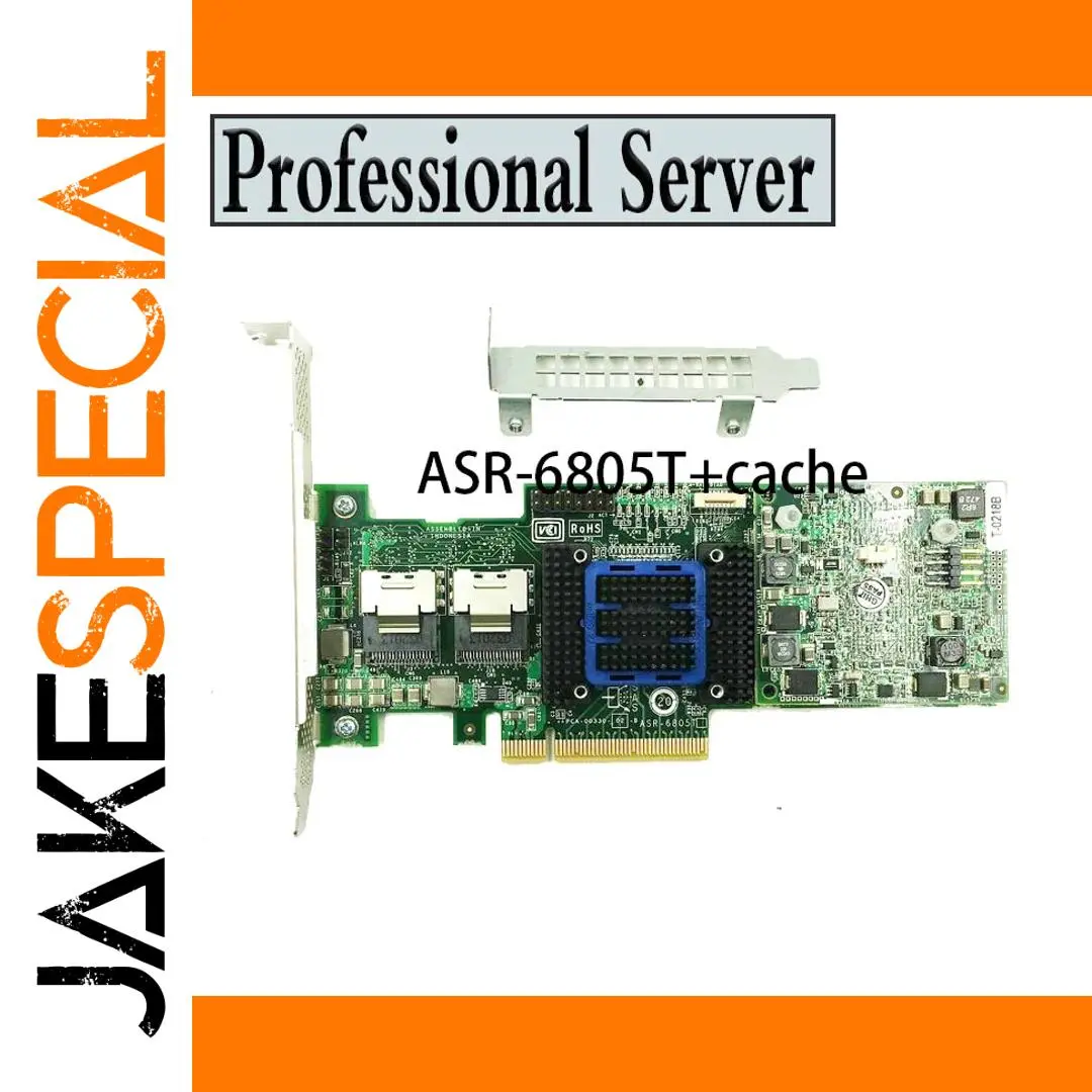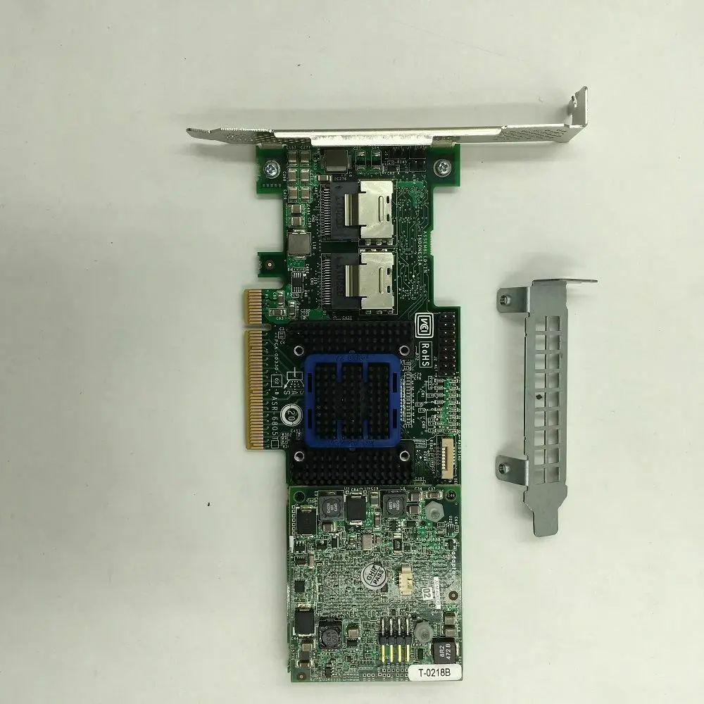 Elevate your data management with the Adaptec RAID 6805T model ASR-6805T PCIe 2.0 RAID controller. Featuring 8 internal SAS ports through two Mini-SAS SFF8087 connectors, it delivers high-speed data transfer at 6Gbps and includes a robust 512MB cache memory for enhanced performance. Designed for enterprise-grade reliability, this add-on card operates in IR mode, ensuring seamless integration into your existing system. The sleek green PCB, complemented by a black heatsink with blue borders and a gold PCIe connector, underscores its premium build and technical sophistication. Trust this RAID controller to provide efficient, reliable, and scalable storage solutions tailored to demanding environments.