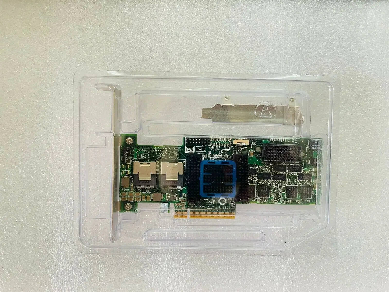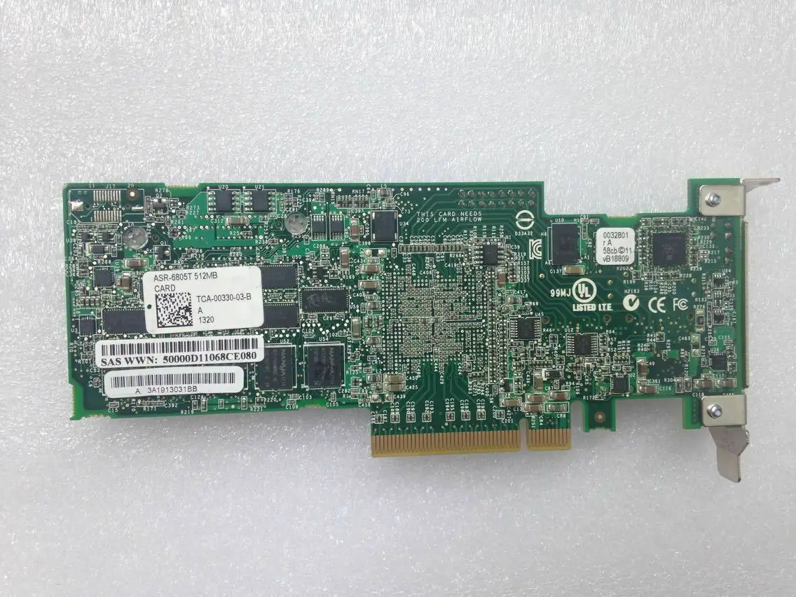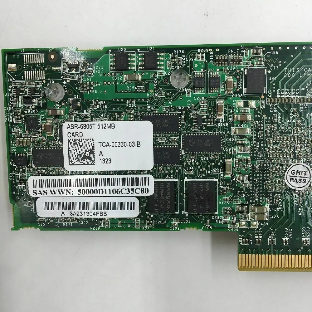 Elevate your data management with the Adaptec RAID 6805T model ASR-6805T PCIe 2.0 RAID controller. Featuring 8 internal SAS ports through two Mini-SAS SFF8087 connectors, it delivers high-speed data transfer at 6Gbps and includes a robust 512MB cache memory for enhanced performance. Designed for enterprise-grade reliability, this add-on card operates in IR mode, ensuring seamless integration into your existing system. The sleek green PCB, complemented by a black heatsink with blue borders and a gold PCIe connector, underscores its premium build and technical sophistication. Trust this RAID controller to provide efficient, reliable, and scalable storage solutions tailored to demanding environments.