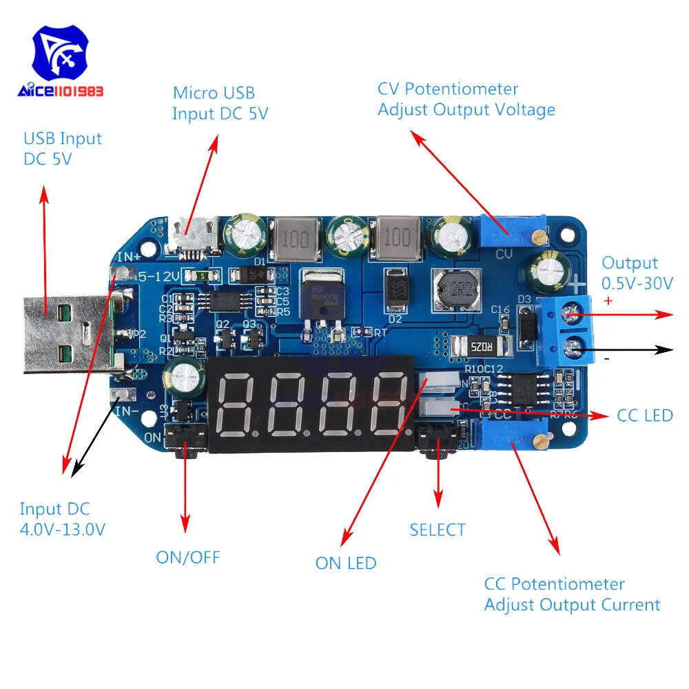 This compact 15W adjustable DC-DC converter features a sleek design measuring 84x35x14mm, supporting input voltages from 4.0V to 13.0V (pads) and 5V via USB. It offers an output voltage range of 0.5V to 30.0V and can deliver up to 2A of current with a maximum power of 15W. Equipped with high-precision displays, it shows voltage (+/-0.1V), current (0-2.2A), and power, along with adjustable potentiometers for precise regulation. The device includes comprehensive protections such as short circuit, over-current, over-voltage, over-power, and over-temperature at 100°C. Its high efficiency (95%) and versatile features make it ideal for power supply, battery charging, LED drivers, and circuit testing.