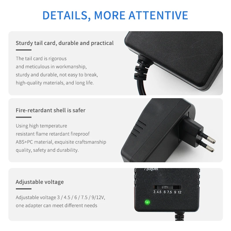 - Supports multiple output voltages: 3V, 5V, 6V, 9V, 12V with adjustable settings for versatile use.