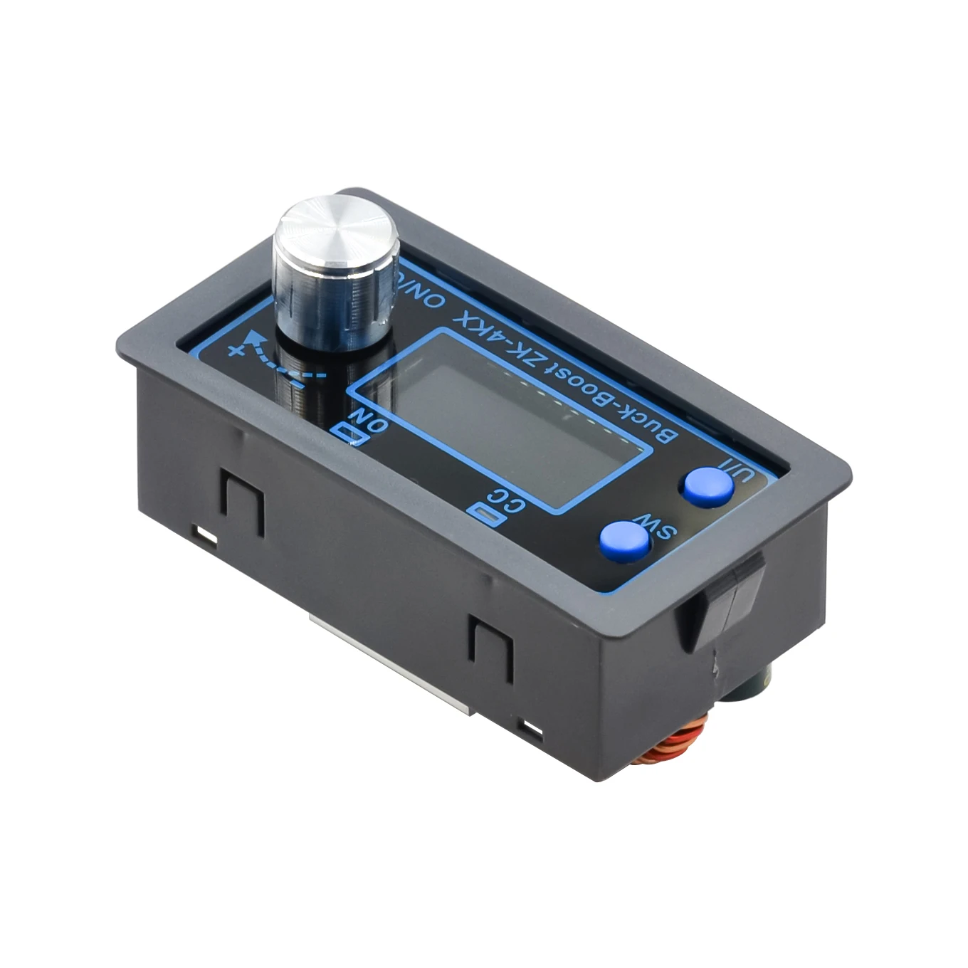 This rugged and compact buck-boost converter module features an adjustable input range of 5.0 to 30V and output from 0.5 to 30V, delivering up to 3A continuously and 4A peak with enhanced cooling, and a maximum power of 35W (50W with improved heat dissipation). It boasts an 88% efficiency, a 1.1-inch LCD display showing precise input/output voltage (0.01V resolution), current (0.001A), and power metrics. Equipped with reverse, over-voltage, under-voltage, over-current, temperature, and time protections, all customizable, it includes a thick heatsink, soft start, and a rotary encoder for fine-tuning settings. Its sleek black enclosure and industrial design ensure durability and high performance for demanding applications.