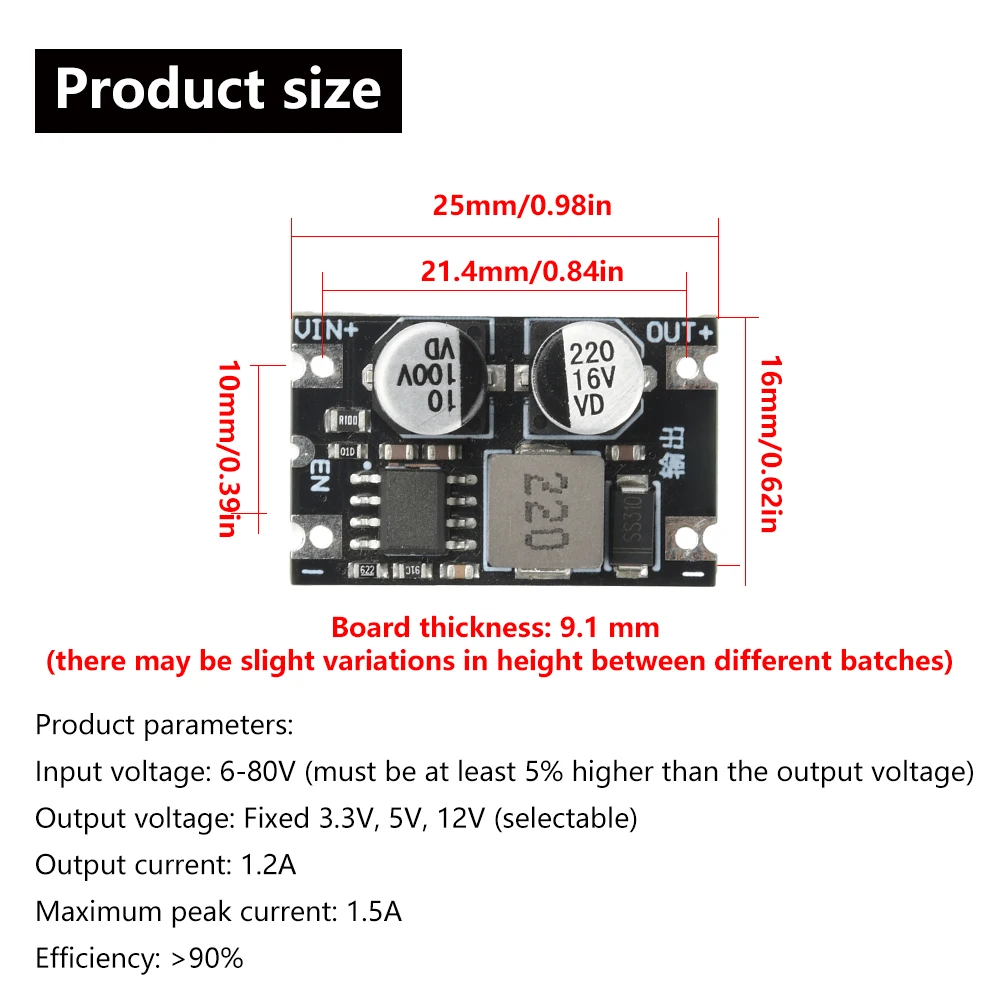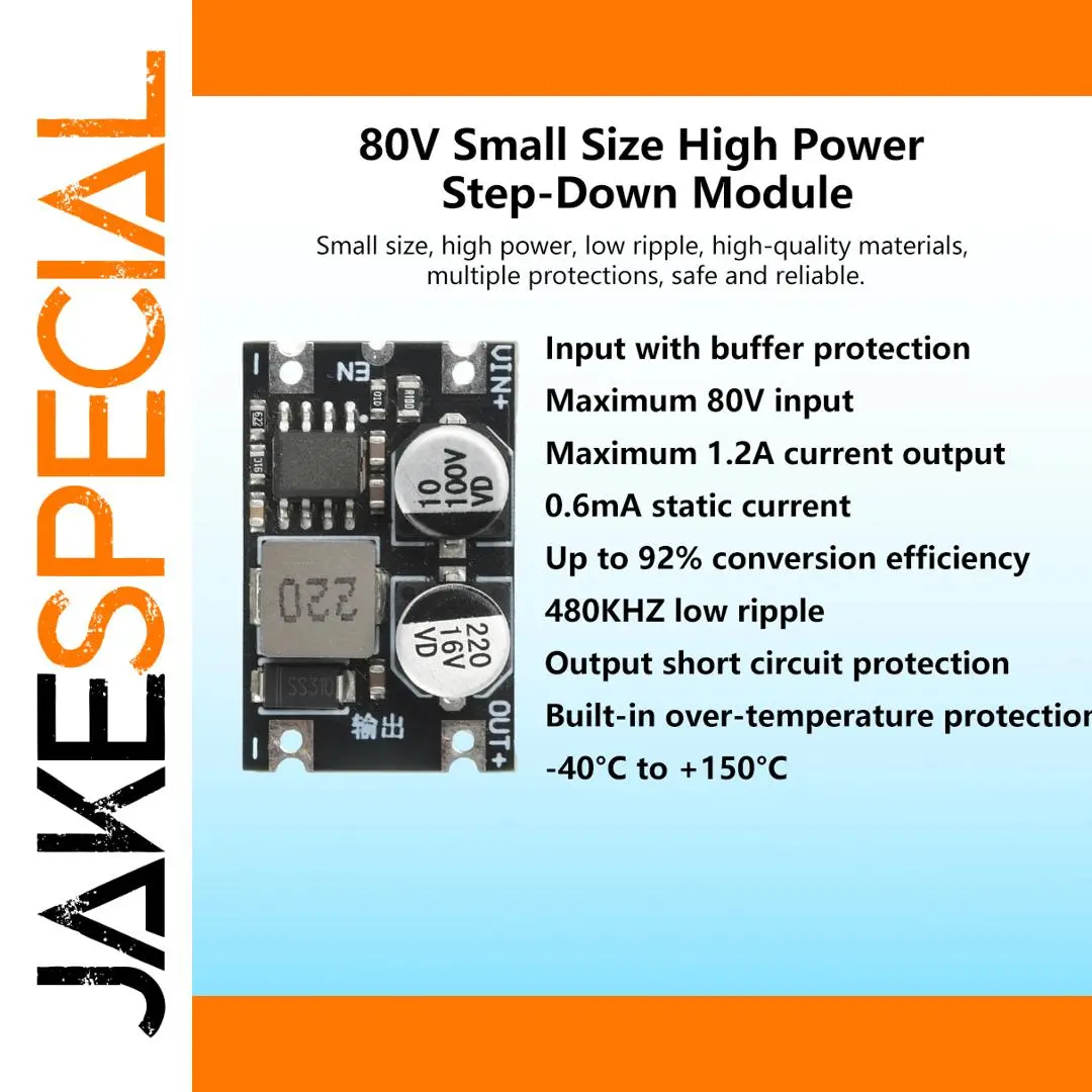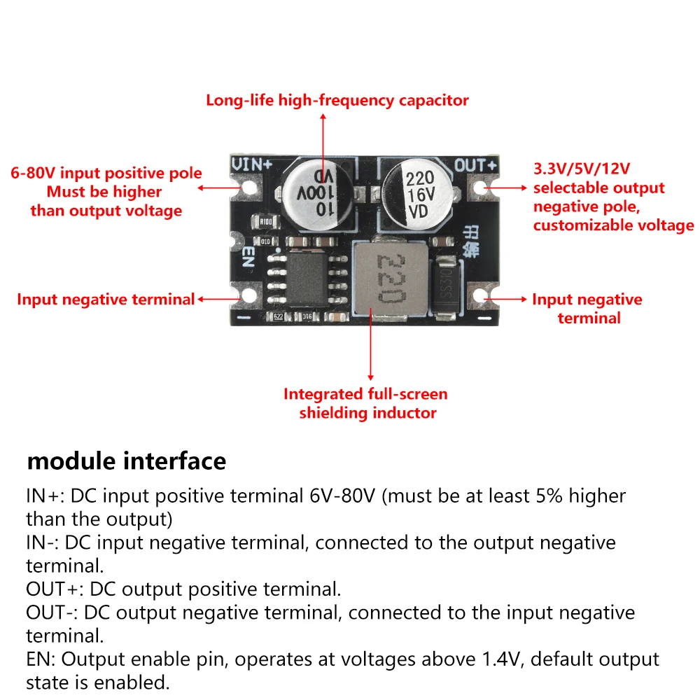 - Supports input voltages from 5V to 80V, allowing versatility in complex power systems with stable output performance across wide conditions.