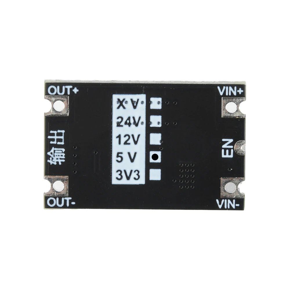 Imagine seamlessly converting a broad range of input voltages from 5V to 80V into a stable output of 3.3V, 5V, or 12V, perfectly suited for your high-power projects. This sleek, compact module boasts a robust black PCB design, featuring two large electrolytic capacitors with shiny silver tops that add a professional touch. Its well-organized layout includes a black IC and a silver rectangular component, complemented by neatly arranged surface-mount resistors and capacitors, demonstrating precision craftsmanship. White markings indicating input and output terminals enhance usability, offering a clean, technical aesthetic that underscores its reliability and high performance.