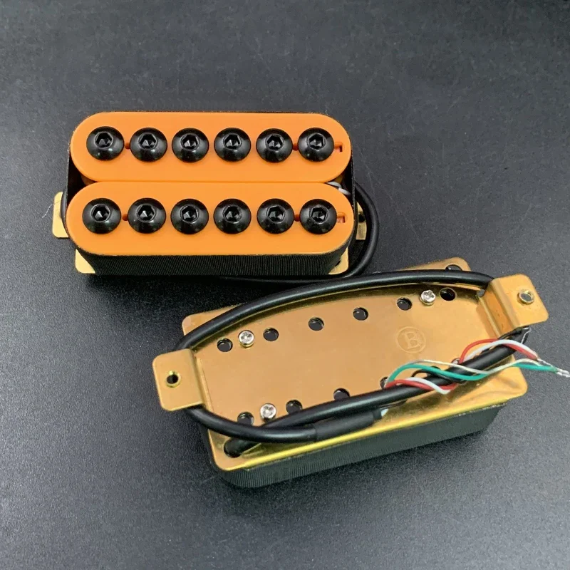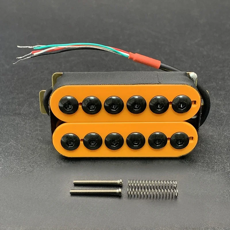 Elevate your guitar’s sound with these adjustable metal double coil electric guitar pickups, perfect for both neck and bridge positions. Weighing 125g each, they feature a pole-piece screw adjustment with a spacing of 50mm for the neck and 52mm for the bridge. Crafted with a durable plastic bobbin and a ceramic bar magnet, these pickups offer a resistance range of 7.5k to 15k. The 4-coil pickup cables measure 340mm for the neck and 300mm for the bridge. Available in a vibrant orange, among other color options, this set is designed to enhance your electric guitar’s performance while providing a modern aesthetic.