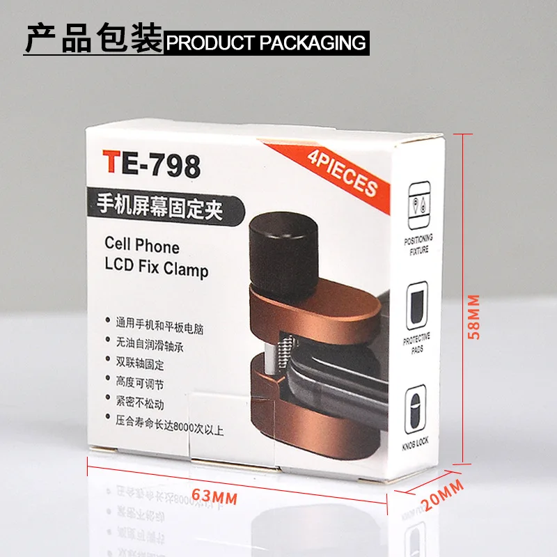 Imagine having the perfect tools at your fingertips to ensure precise, secure fixes during mobile phone repairs. This set of four adjustable metal clamps, crafted from durable alloy steel, offers a sleek, professional appearance with a shiny, metallic finish in copper or bronze hues. Their rectangular shape with rounded edges provides a modern, industrial aesthetic while remaining functional. Designed to accommodate various device sizes, these clamps feature black textured knobs for a firm grip, easy adjustments, and gentle protection of delicate LCD screens. With a compact size of 58mm x 63mm x 20mm, they are ideal for securing mobile display units without causing damage. Trust these fixtures for accuracy, durability, and efficiency during intricate repairs.