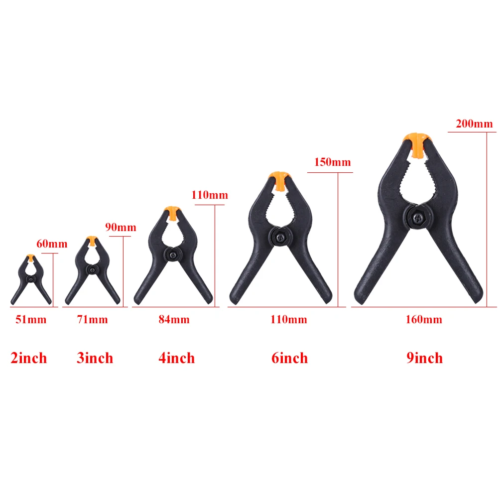 Enhance your woodworking and DIY projects with this versatile set of adjustable plastic spring clamps, available in 2-inch, 3-inch, 4-inch, 6-inch, and 9-inch sizes. Crafted from durable nylon plastic, these clamps feature non-slip ridged handles for secure grip and easy operation. Their sleek, utilitarian design includes smooth hinges and spring mechanisms, making them ideal for woodworking, crafts, photography backdrops, and general clamping tasks. The set includes ten 2-inch clamps, one 9-inch clamp, two 6-inch clamps, four 4-inch clamps, and six 3-inch clamps, providing a comprehensive solution for your clamping needs.