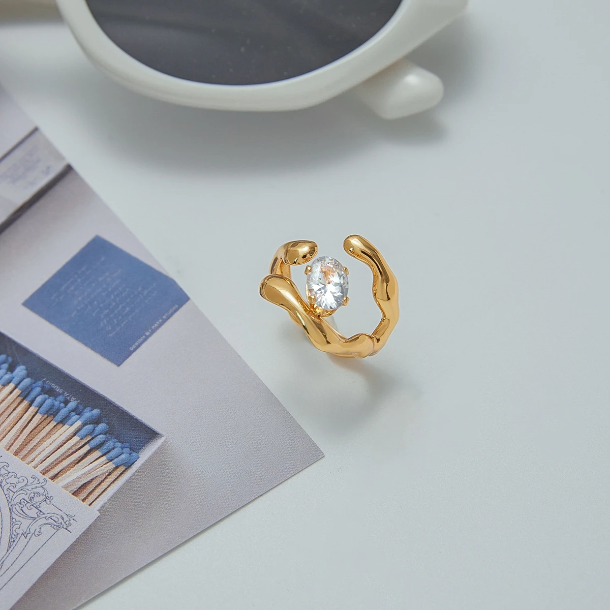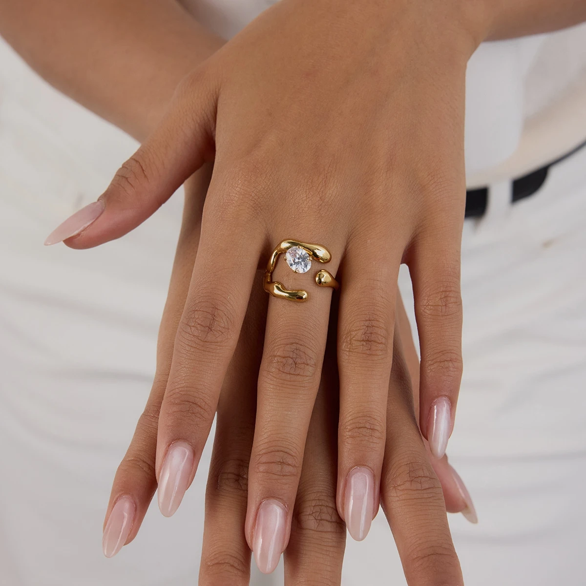 Experience the perfect harmony of modern artistry and elegance with this beautiful adjustable women's ring. Crafted from durable stainless steel with a luminous gold finish, it exudes luxury while remaining resilient for everyday wear. The delicate 2mm wide band features an open, flowing design with organic, water-inspired curves that evoke movement and softness. At its focal point, a single round white zirconia gemstone is securely set in a prong setting, offering brilliant sparkle and contrast against the gold surface. Its lightweight and flexible structure ensure a comfortable fit, making it ideal for both casual and special occasions. This ring adds a touch of refined sophistication to any look and can be easily adjusted to suit your style.