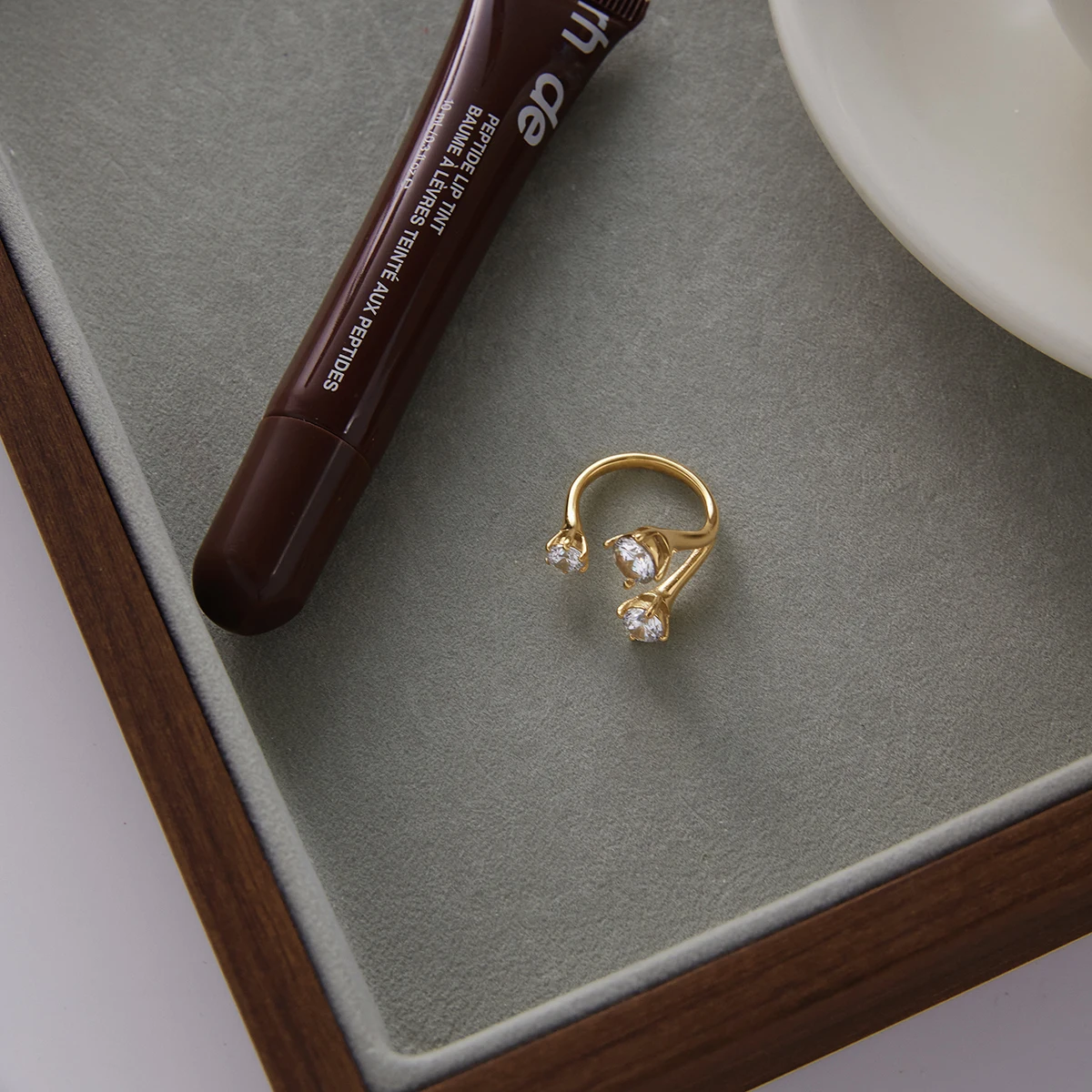 - The design features three large, faceted cubic zirconia stones set asymmetrically in a prong setting, creating a trendy geometric look with brilliant sparkle.