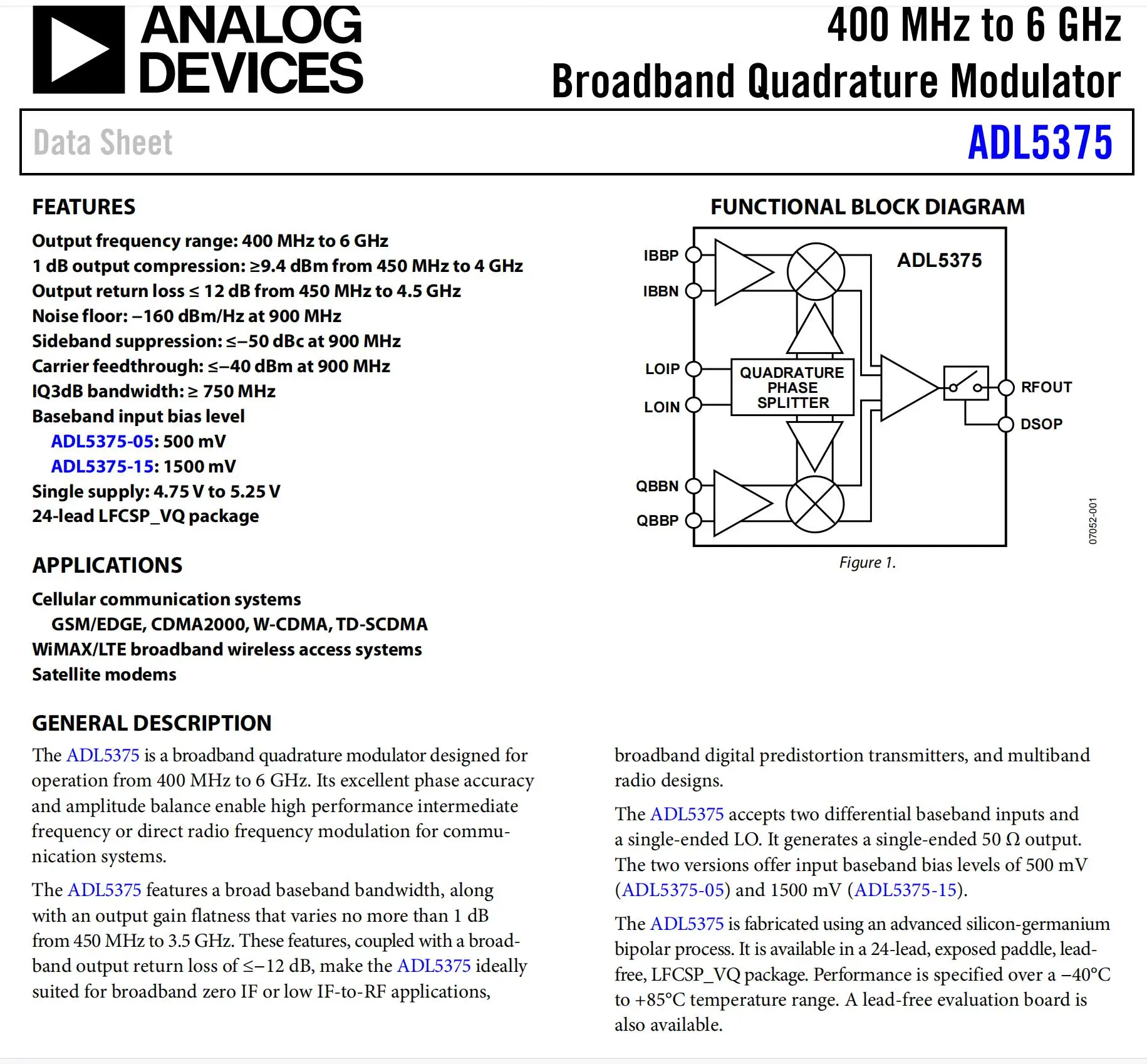 Keys features of the product ADL5375 IQ Modulator Mixer