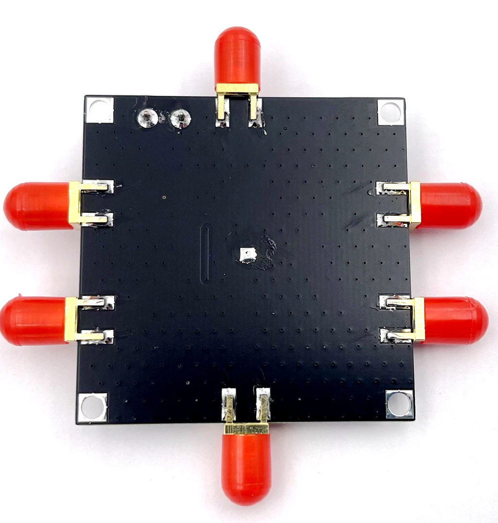 - Features a compact 5cm x 5cm square design with matte black finish, accented by color-coded RF input/output ports covered with vibrant red conical rubber caps for protection.