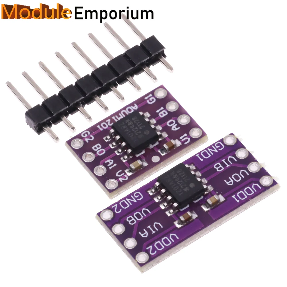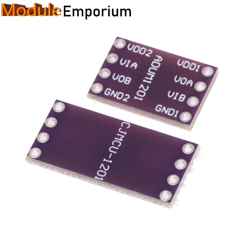 Discover the precision and reliability of this ADUM1201 digital isolator module, designed for seamless electrical isolation in high-speed data transmission applications. Featuring a sleek purple PCB with a glossy finish, this module combines modern aesthetics with outstanding technical performance. Its compact rectangular design with rounded corners provides a streamlined look, perfect for integration into various electronic systems. The black IC chips and pin headers deliver a bold, professional contrast against the vibrant purple background, while crisp white silkscreen markings ensure clear identification of pin functions. Whether you're upgrading your communications project or creating a durable industrial control system, this module offers both style and function. Experience enhanced performance, superior noise filtering, and compact design in one reliable package.