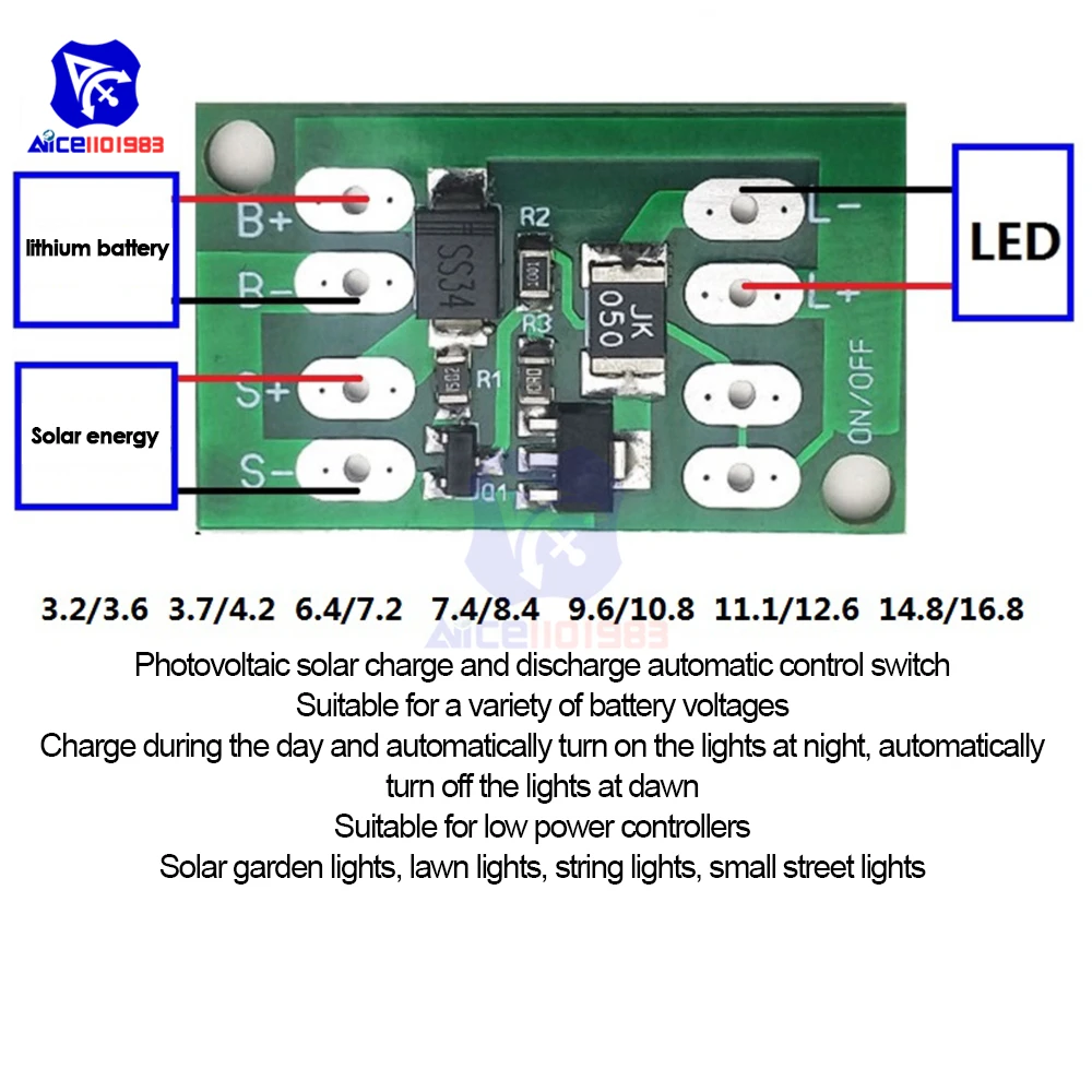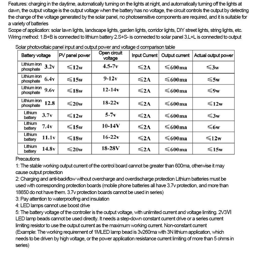 This solar charge controller circuit board features a compact green design with clearly labeled connection points for efficient solar battery management. Supporting a maximum output current of 600mA, it automatically controls street lamp lighting by detecting voltage changes from the solar panel, turning lights on at night and off at dawn without photosensitive components. Compatible with 3.7V lithium batteries equipped with protection boards, it is suitable for various DIY solar applications. The device includes wiring for lithium batteries, solar panels, and load output, with a switch interface for manual control. Its precise layout and reliable functionality make it ideal for efficient, automatic solar-powered lighting systems.