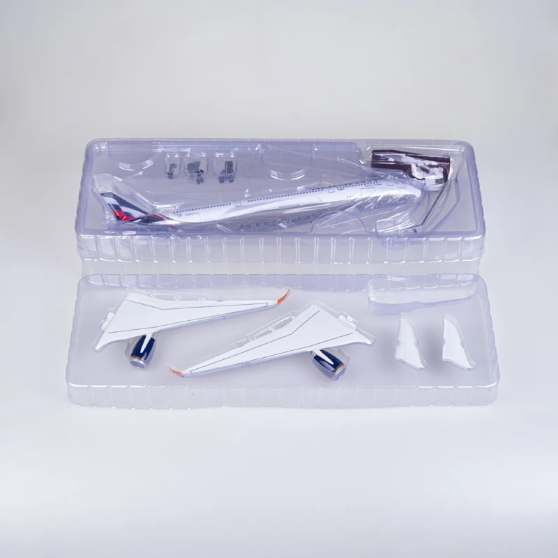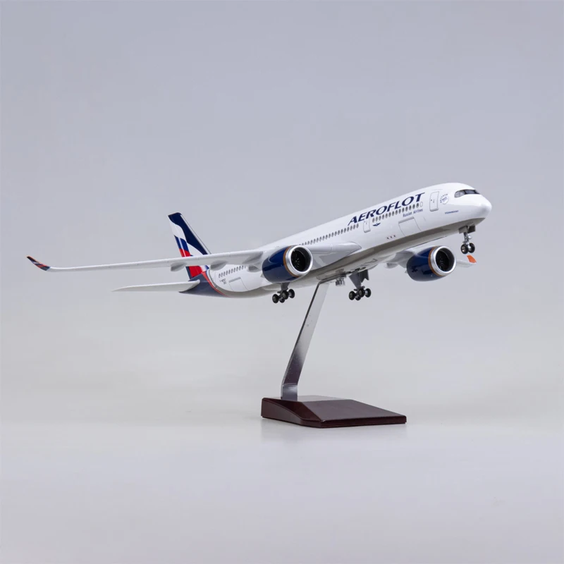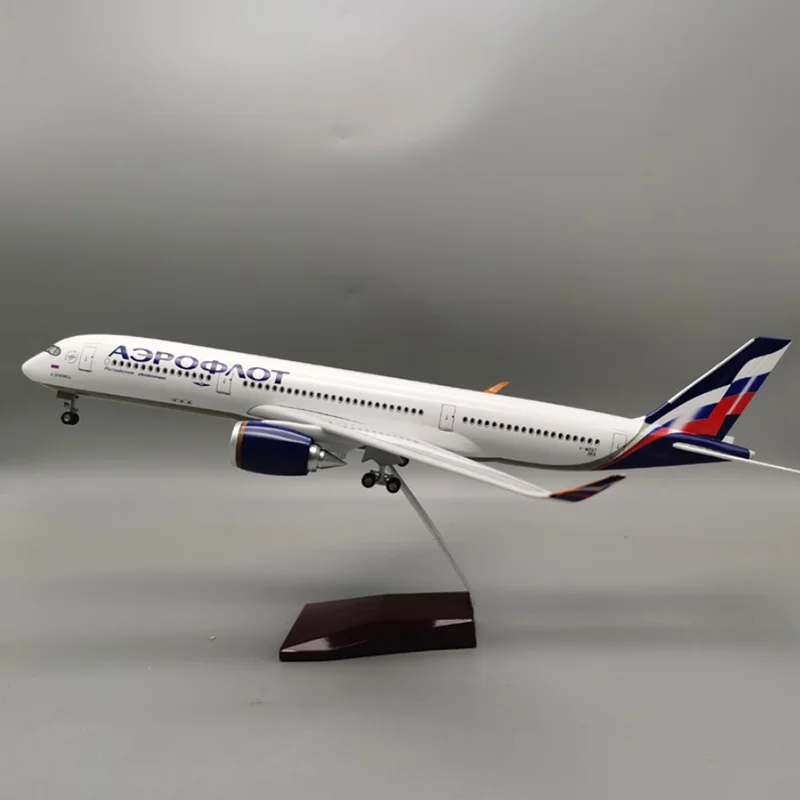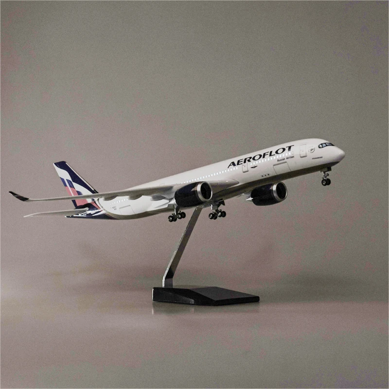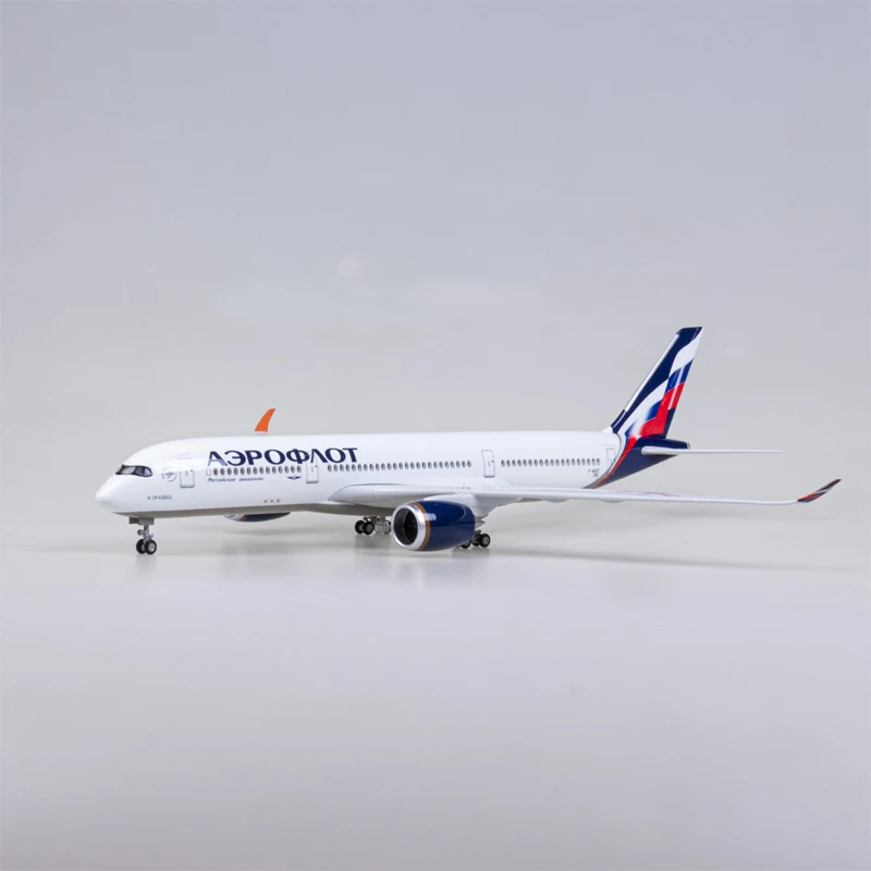 This 47cm scale model of an Airbus A350, crafted from resin, features a detailed white fuselage with Aeroflot’s signature livery, Cyrillic lettering, and a vibrant tail logo in blue, silver, and red. Equipped with removable wings and wheels for assembly, it includes a voice-controlled cabin light that operates for around 20 seconds and requires charging. Designed for collectors aged 14 and above, this fragile diecast replica emphasizes realism and craftsmanship, making it a stunning display piece. Available with or without lighting, it combines elegance and technical precision, perfect for aviation enthusiasts seeking a high-quality, highly detailed aircraft model to showcase.